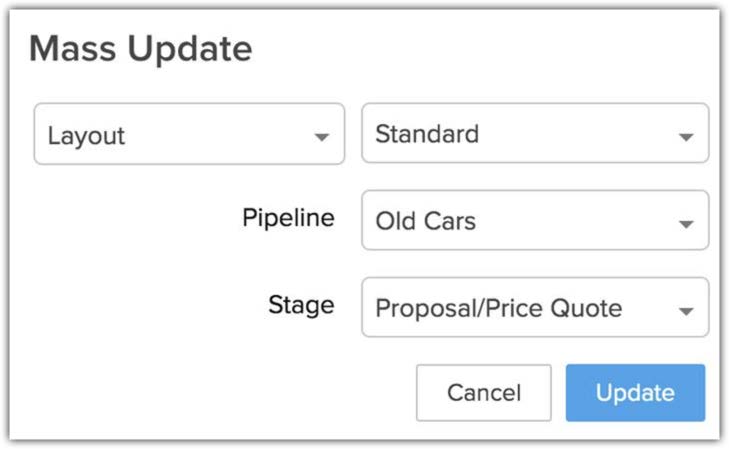 When you mass update records, keep in mind that a pipeline is layout specific and the stages in it are specific to a particular pipeline. During the mass update, records will always be checked for a match in the following order: Layout > Pipeline > Stage. (You can mass update the layout, pipeline field, and stage field on records).