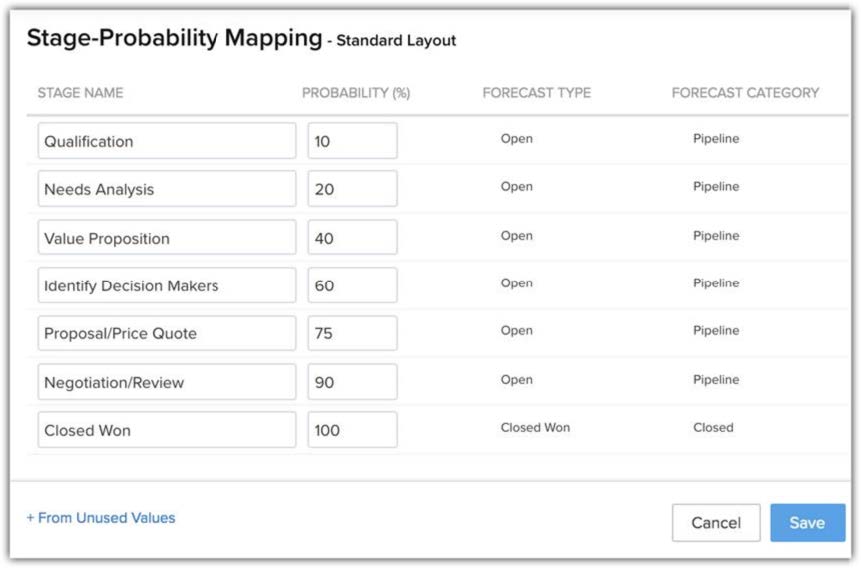 When you create a new pipeline, you can create new stages and assign probability values to them, but you cannot modify the probability for the existing stages from the pipeline creation screen. You need to go to Stage Probability Mapping to change the probability for other stages.