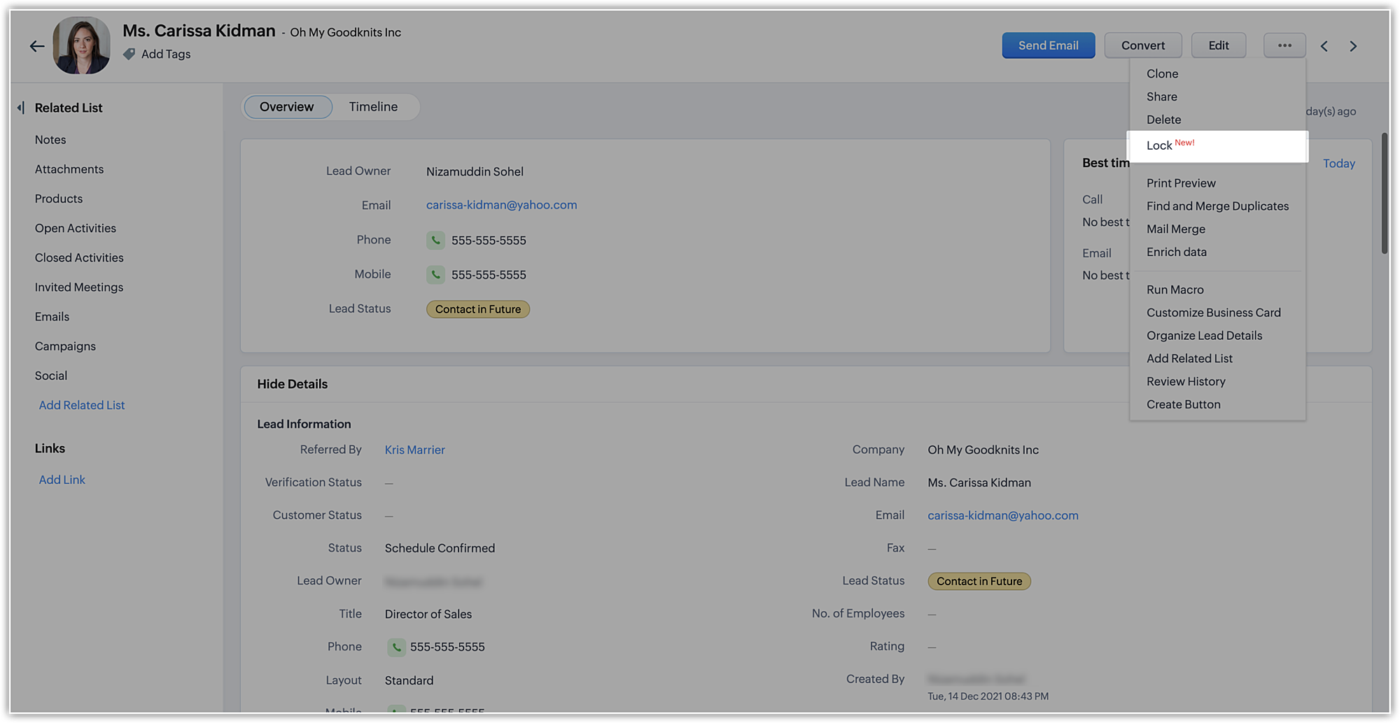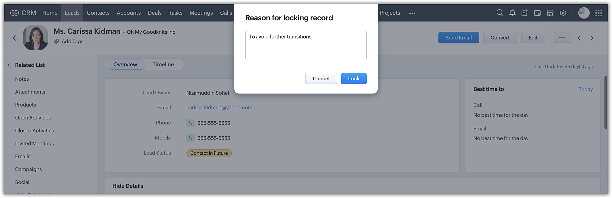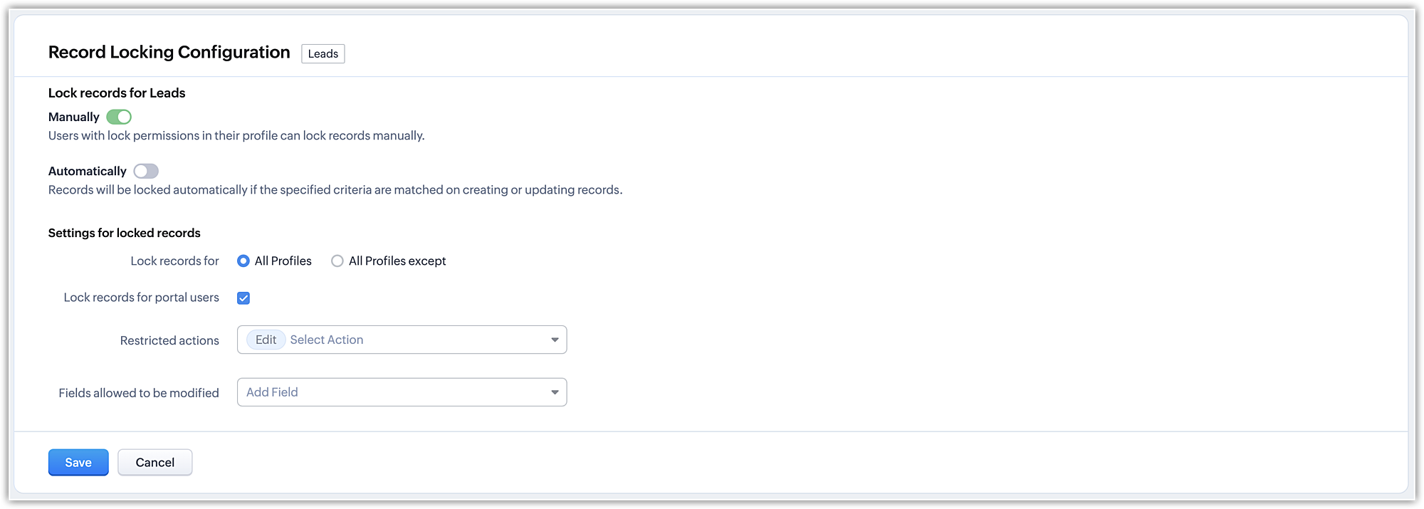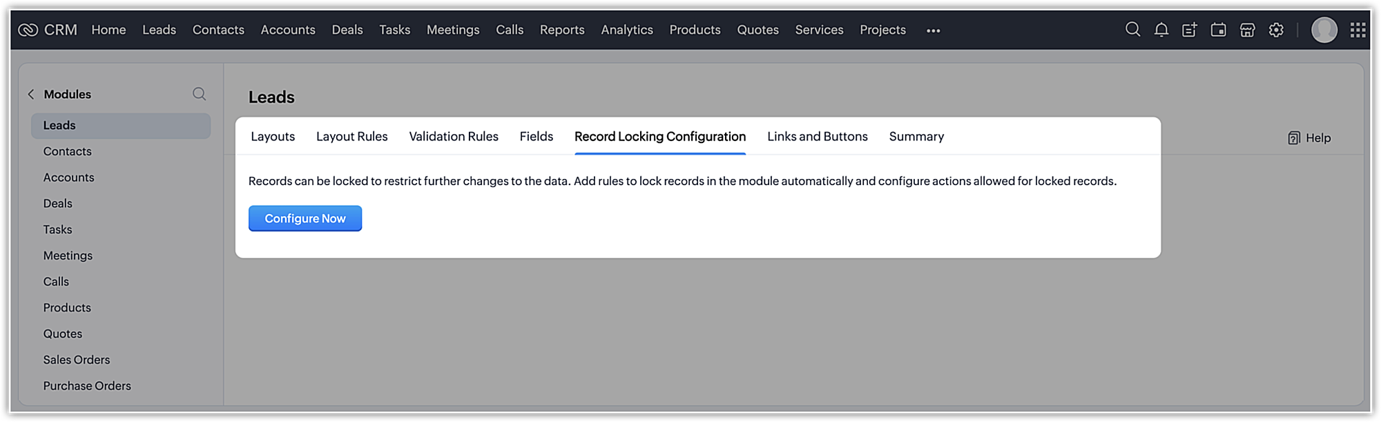 Certain business scenarios demand records in modules within your organization to be restricted from edits or deletion once they reach a certain stage in your sales process or satisfy some specific condition. Record locking is a configuration that allows you to lock those records manually or automatically when certain conditions are met.