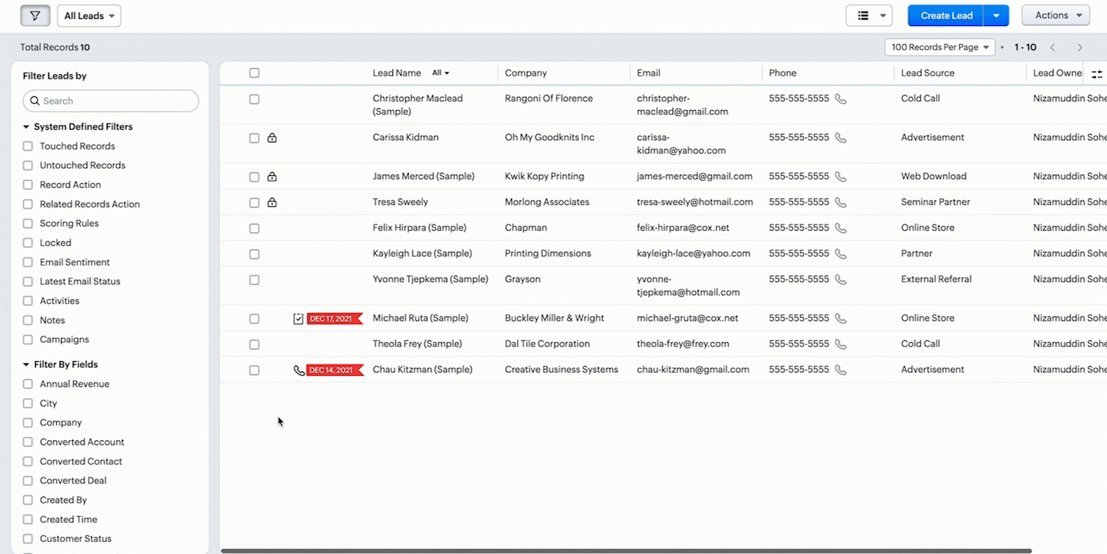Additionally, you can filter records on the list view based on the pre-defined filter option, as well as use the system-defined custom view.