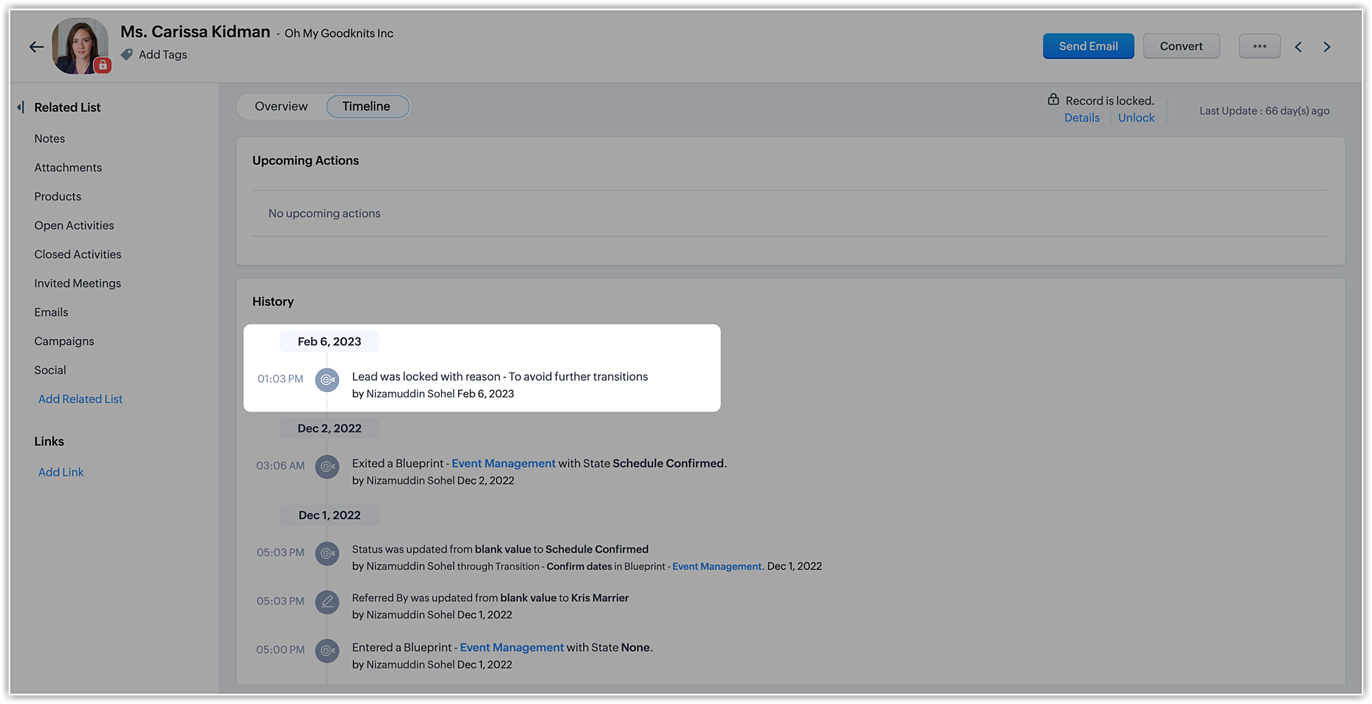 You can also see the details with the timestamp of when the record was locked and the condition that was followed in the record's timeline.
