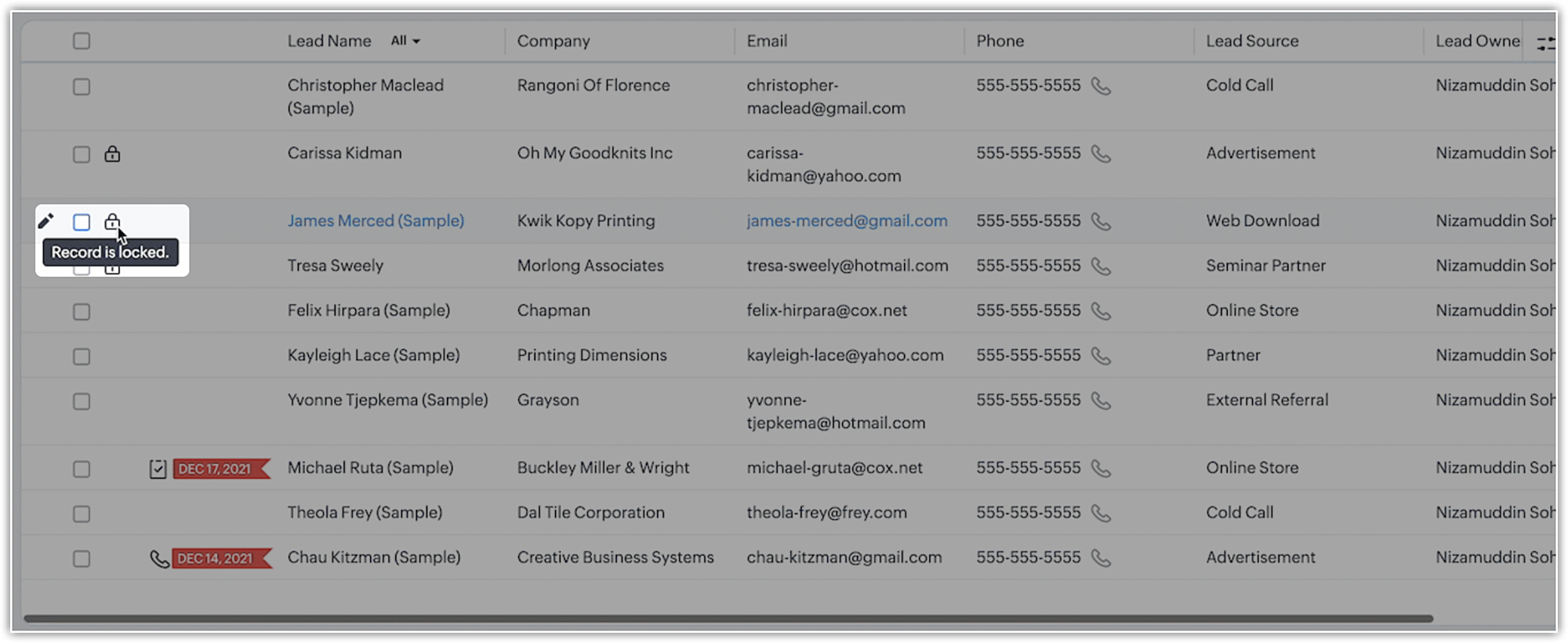 - When an org is downgraded to lower editions of Zoho CRM, the locked records will be automatically unlocked; the locked status cannot be regained upon upgrade.