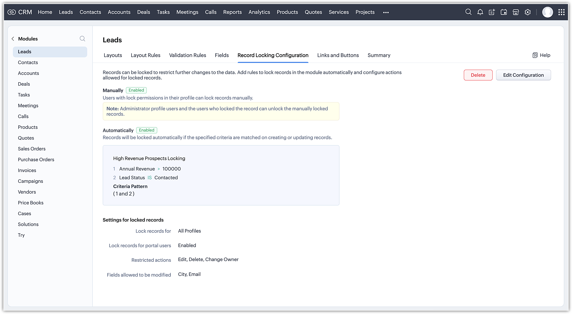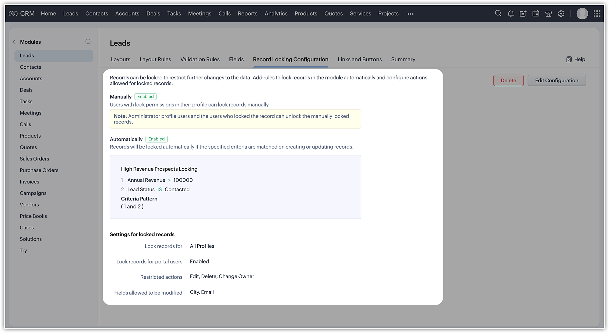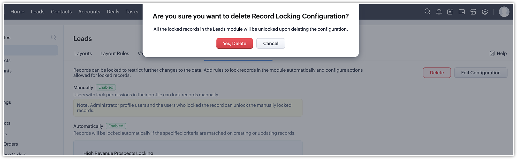 - If you delete the rule in the record locking configuration, the records locked through those rules will be unlocked automatically. If the locking configuration is deleted, all the records in the module will be unlocked.