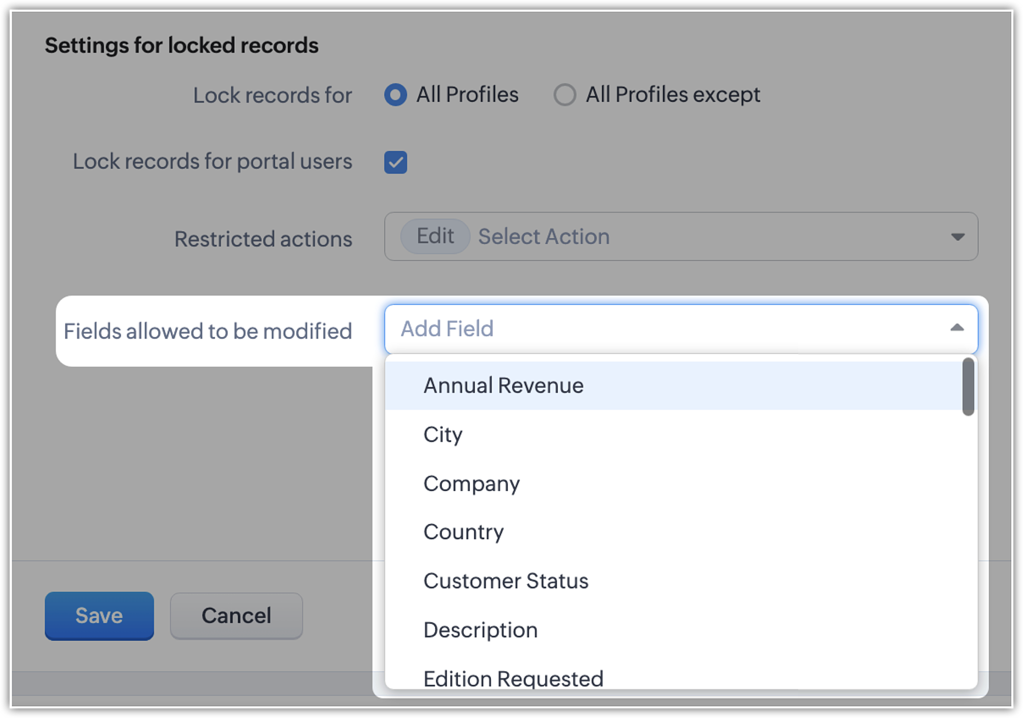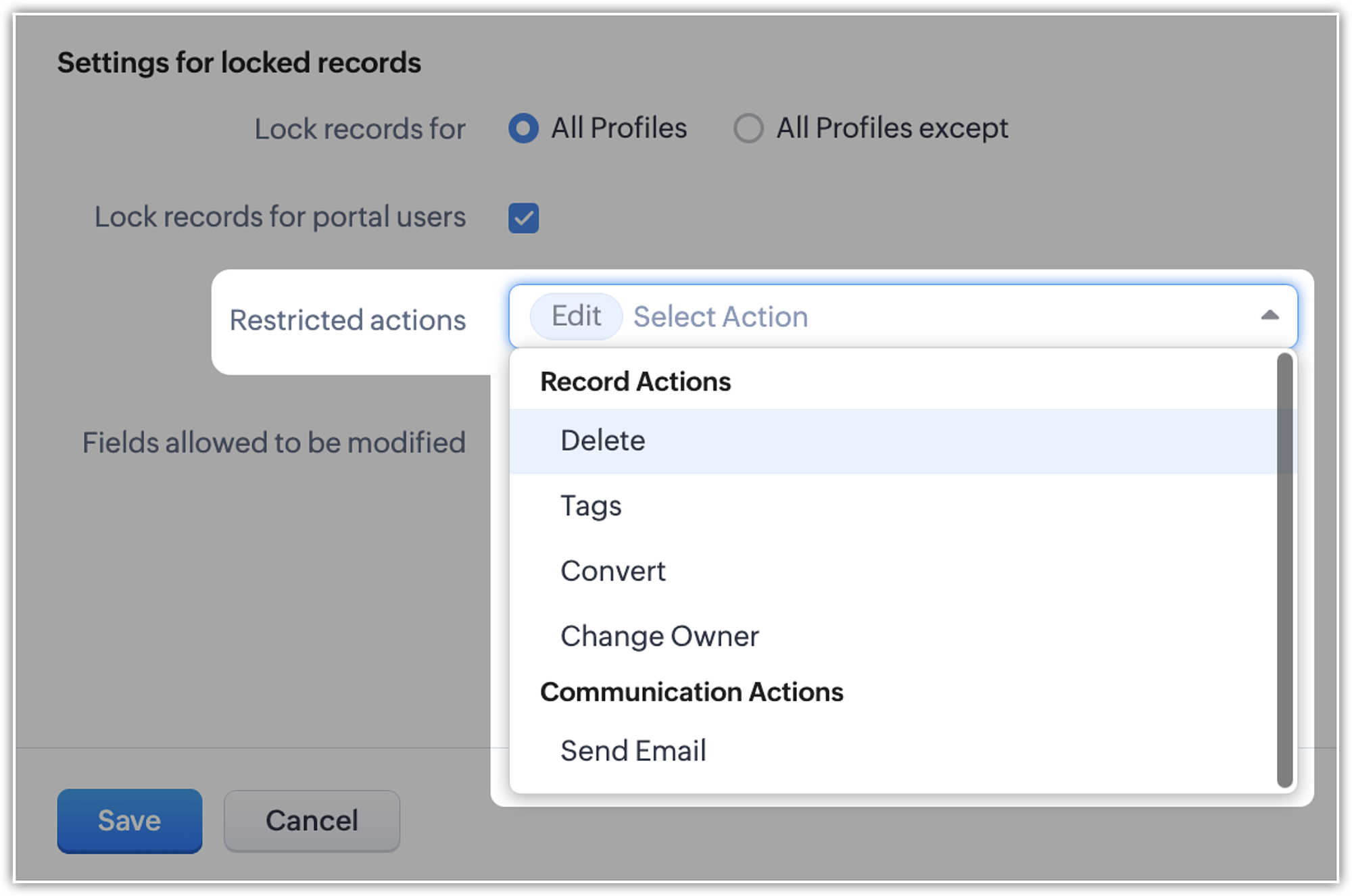 Edit action is restricted by default. - Fields allowed to be modified: Select the fields that will be allowed to modify for a locked record.