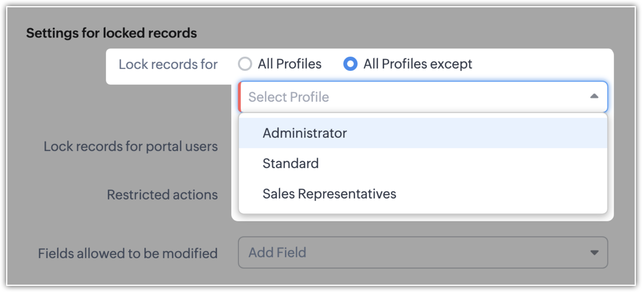 - Lock records for Select whether to lock records for all profiles or all profiles with a few exceptions. You can select the exceptions from the multiselect.