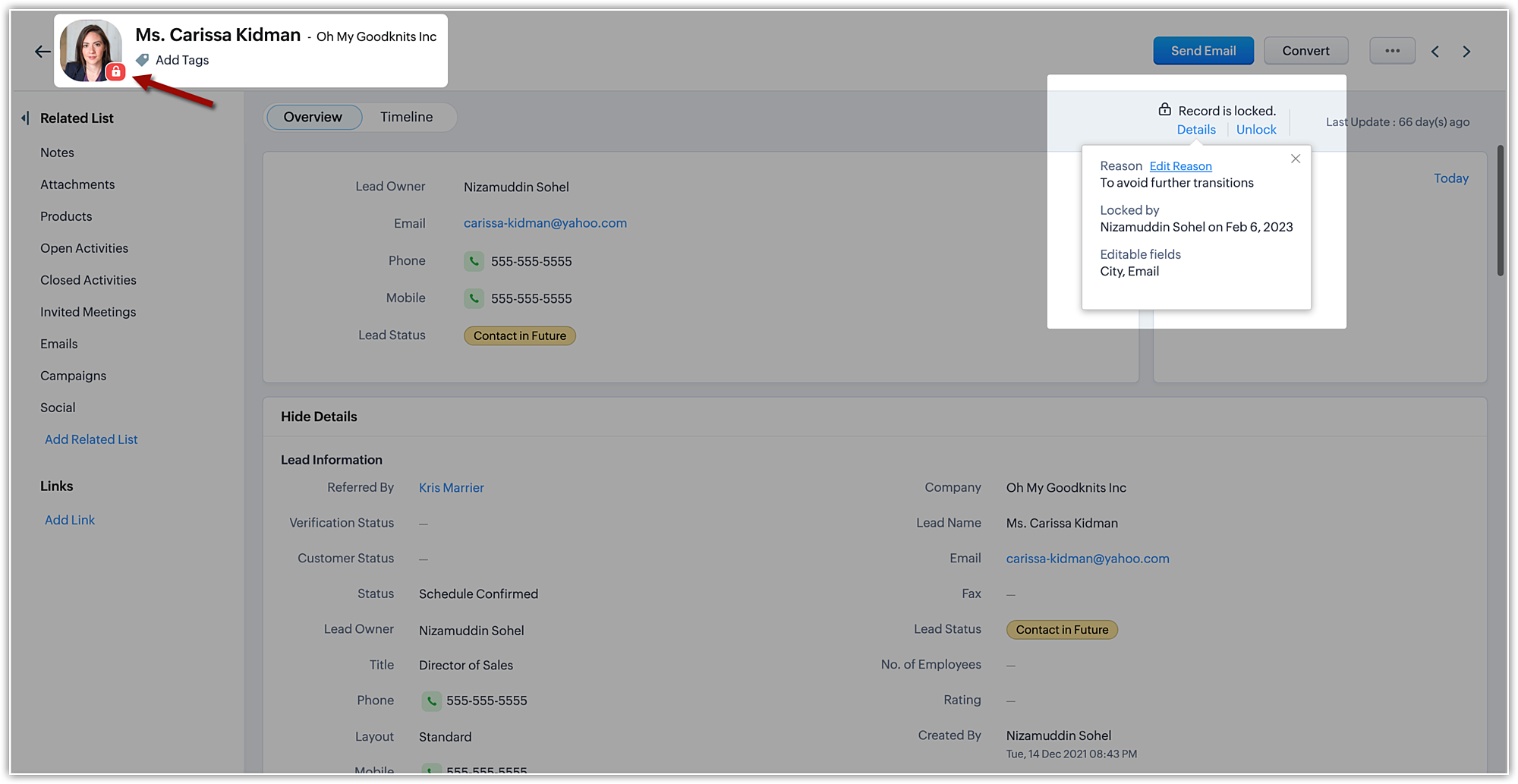 - Record Details page: On the Record Details page, a lock icon will be shown with the record image, as well as on the UI of the record detail page you will see "Record is locked" along with the options to check details about the locking, and the option to unlock.
