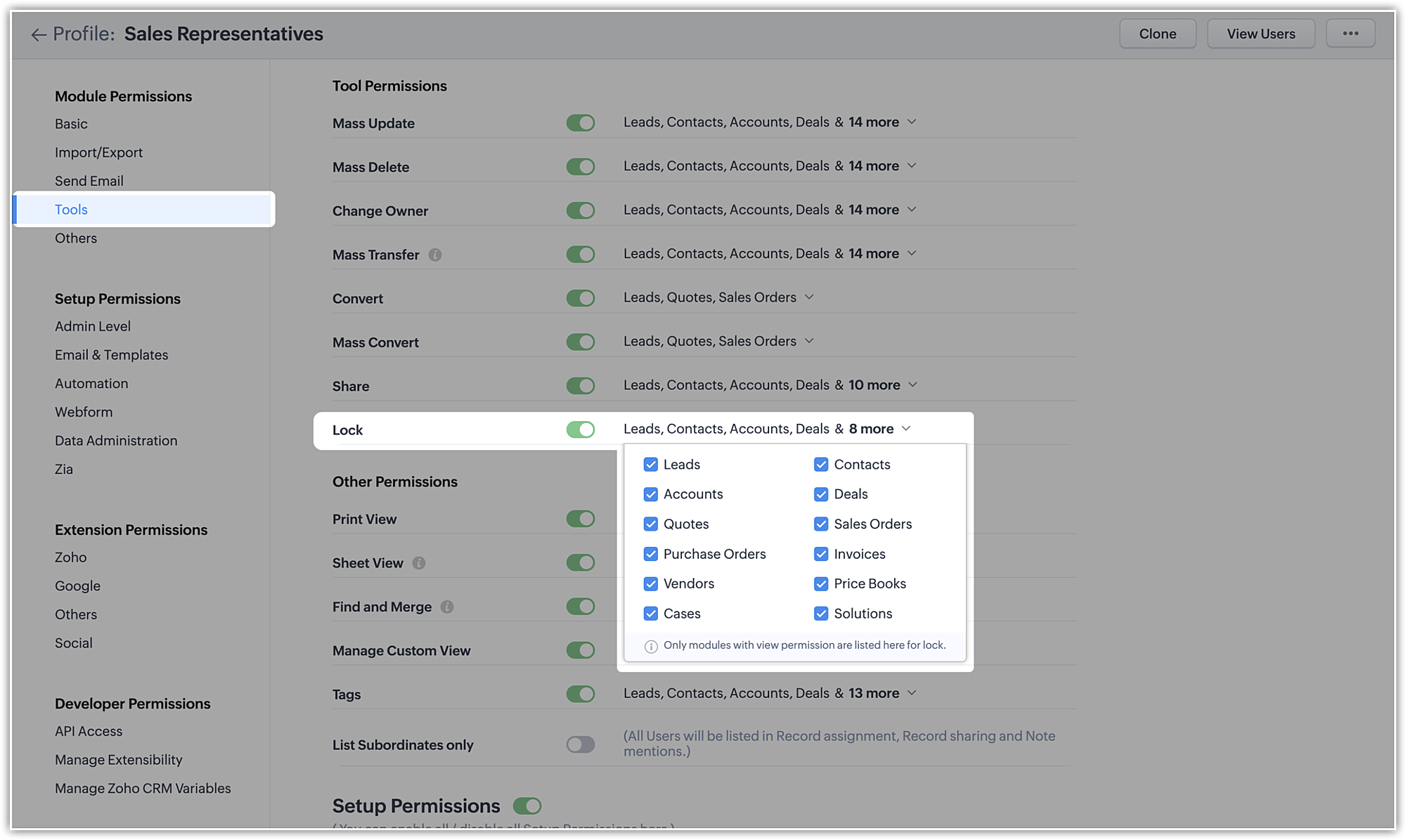 The profile permission will be available in Tools under Module Permissions. Upon enabling it for a profile, the administrator can select the modules for the profile to lock.