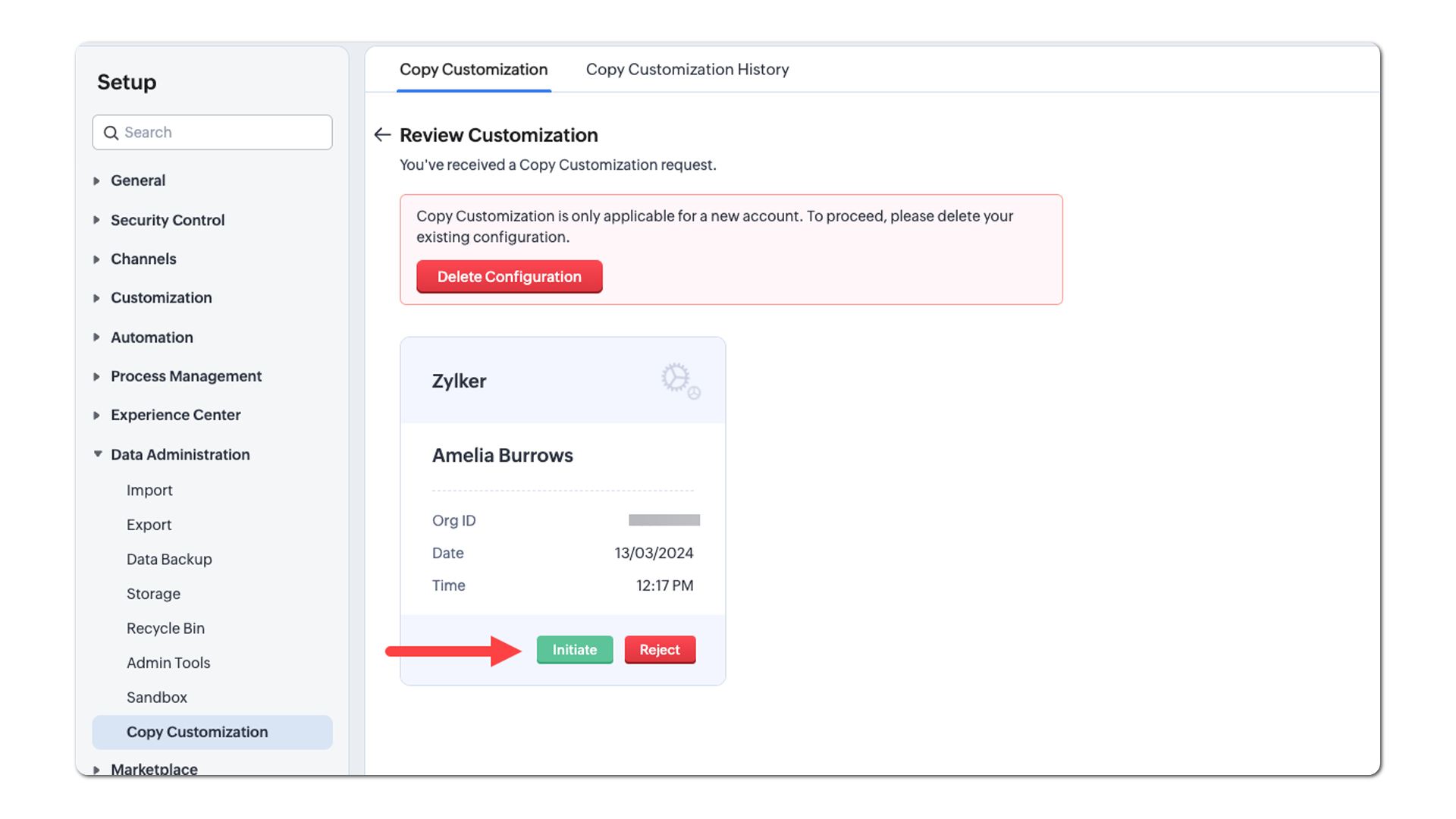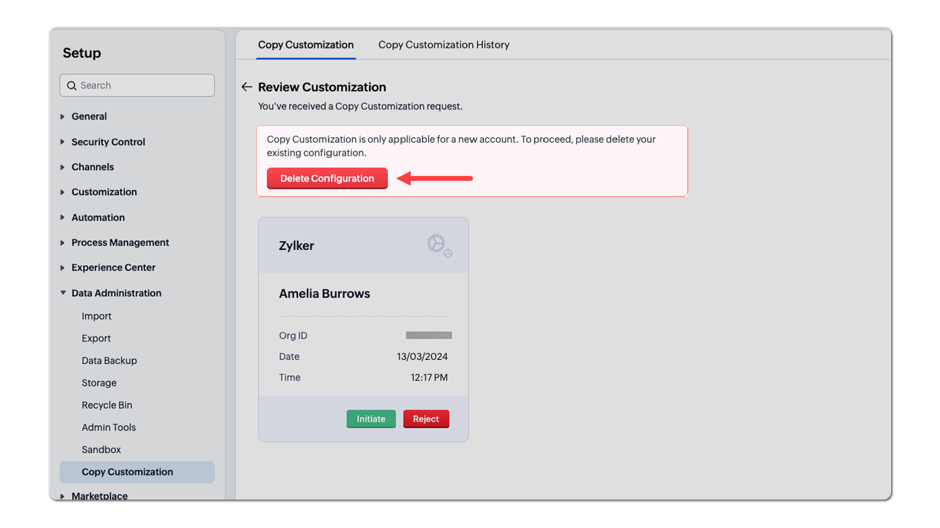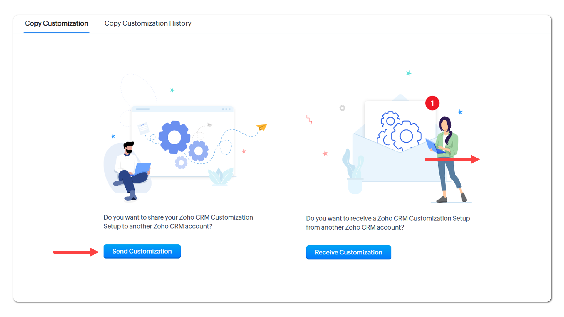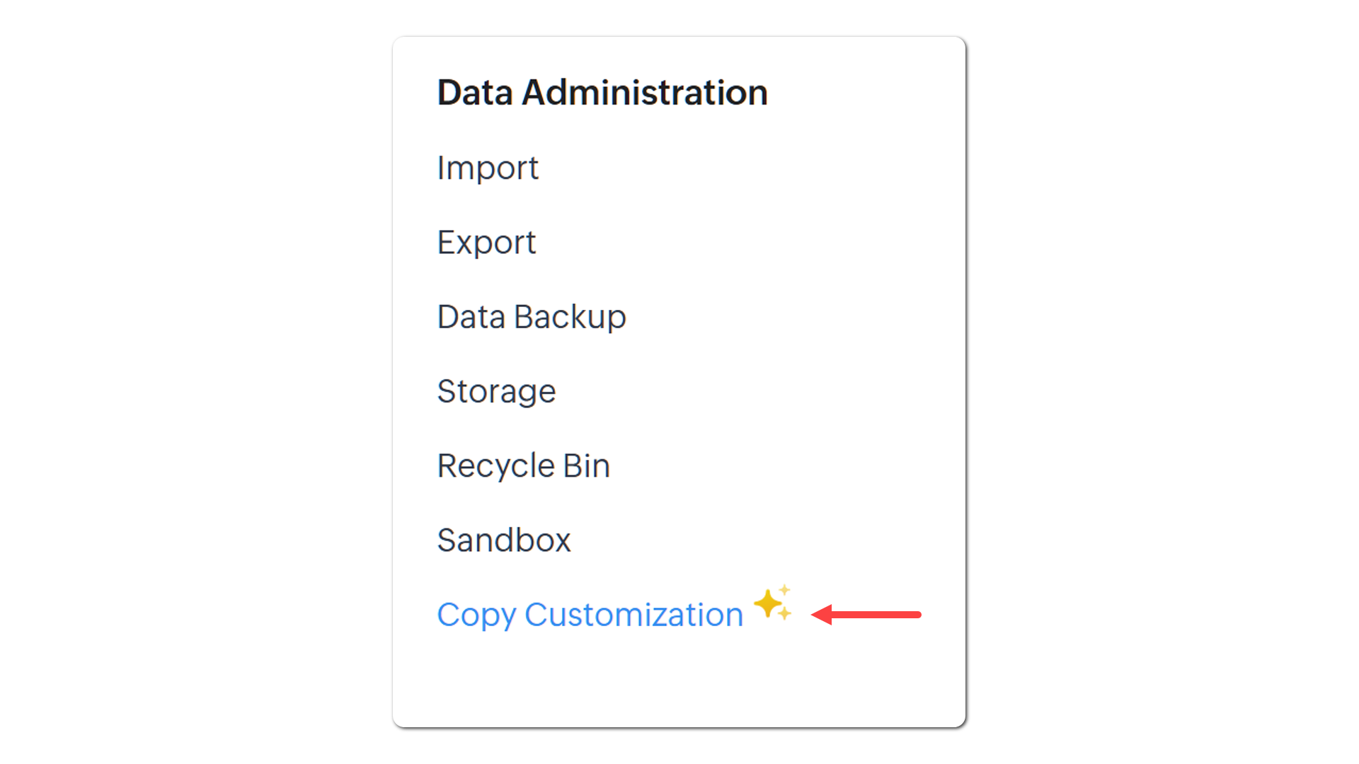 Copy Customization is a no-cost, no-code tool in Zoho CRM that enables you to send and receive complete CRM configurations without the need for custom code. Copy Customization does not copy data from one CRM account to another. To copy data between two Zoho CRM orgs, please check Migrating Data Between Zoho CRM Accounts.