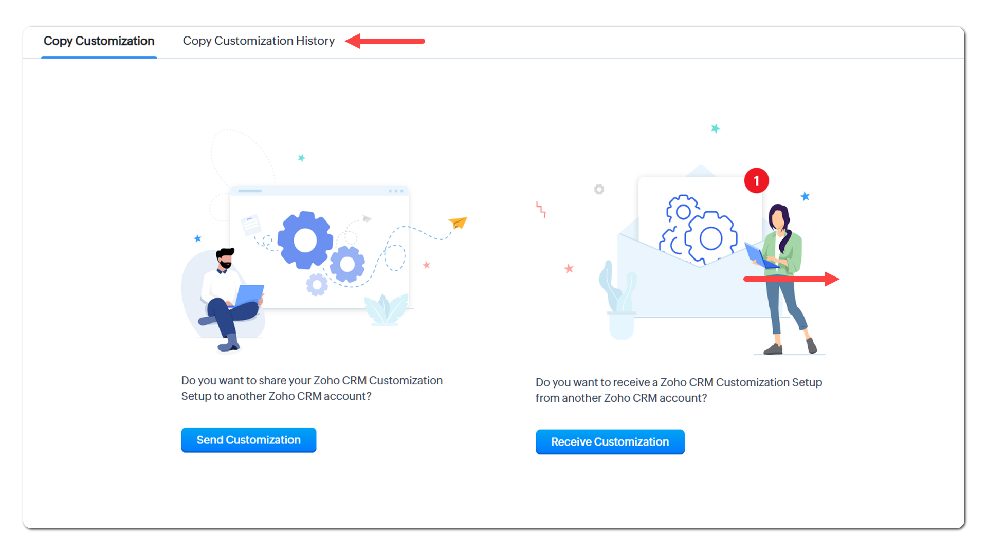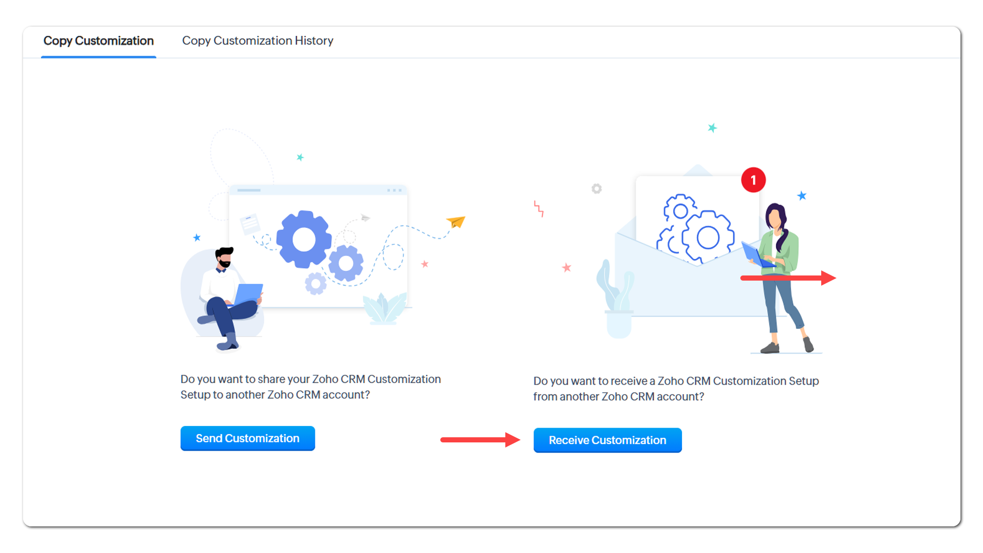 2. Receive Customization: Click this to receive another CRM's customization and initiate its copying onto your CRM account.