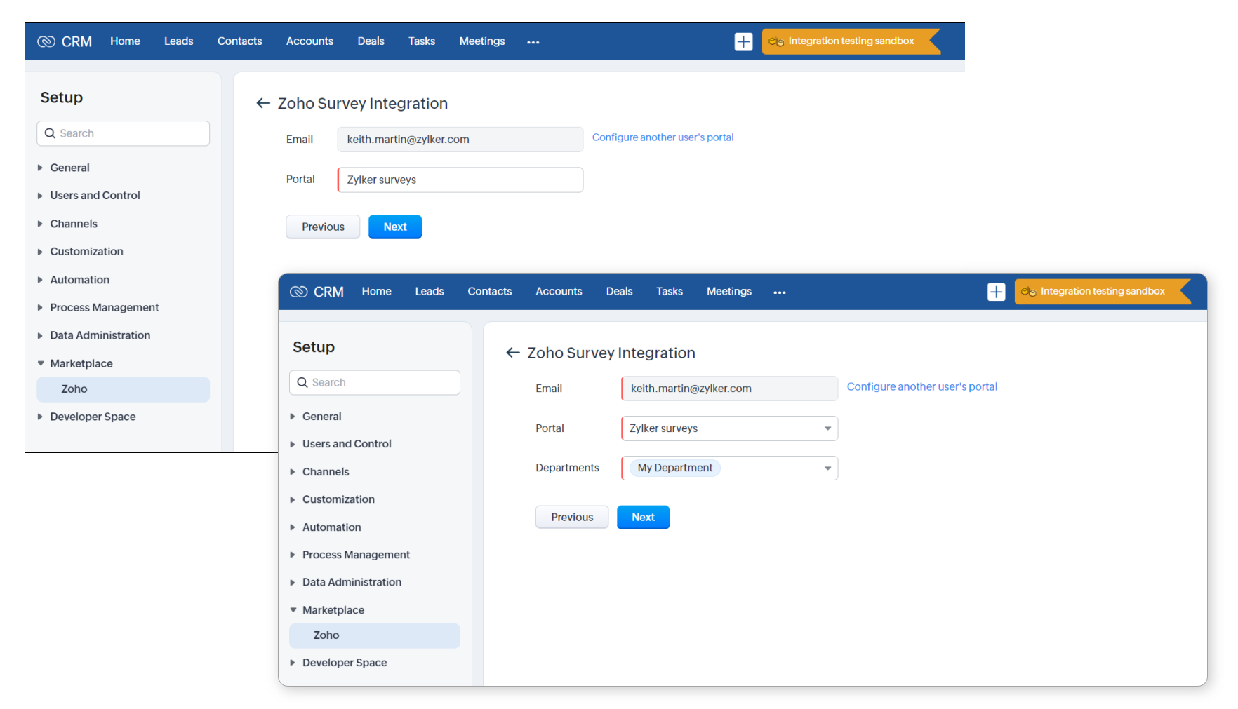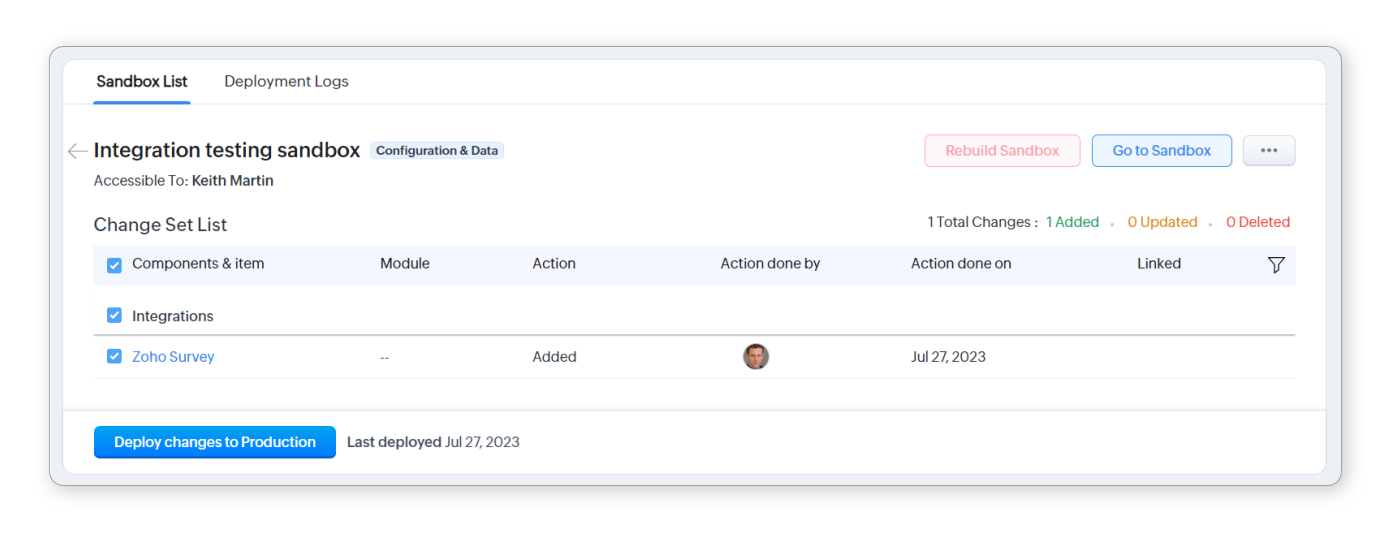 Before using the Zoho Survey integration in your actual production environment, it's best to test it in a sandbox environment. This lets you see how the integration affects your CRM system and internal processes. Once you're satisfied with the testing, you can confidently deploy it to your live environment.