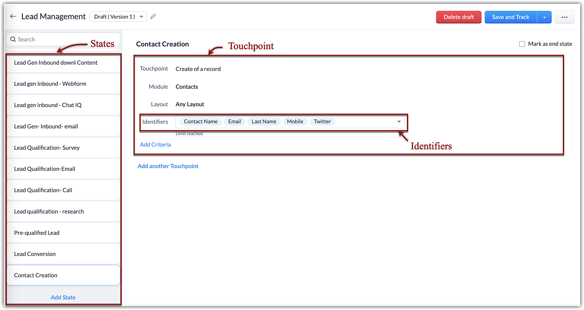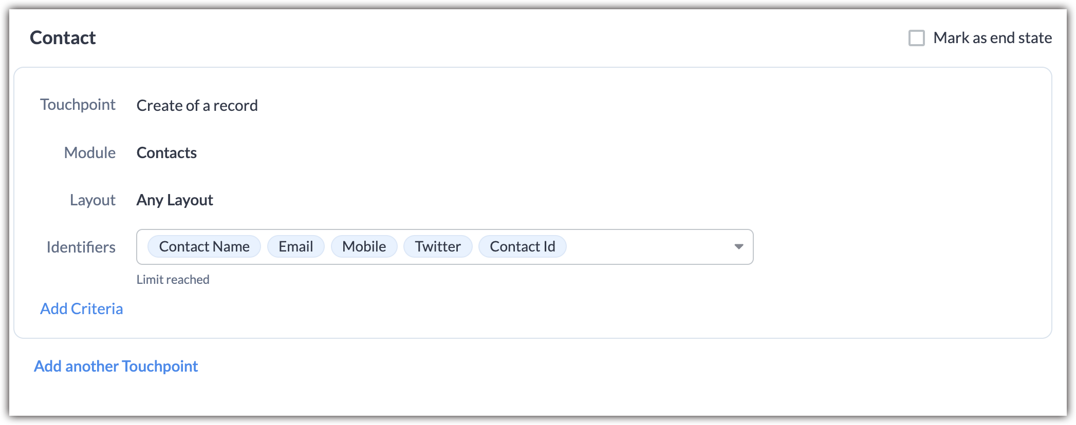 Here, the above touchpoints have different triggers, assigned to the same state, Lead Generation, and the same module, Leads. As you can see, email address is a common identifier, the value of campaign ID and record ID points to the same record. - Conversion of a lead record is another touchpoint that indicates lead conversion. The identifier that is configured here will relate to the fields present in the contacts module. This is where you have to take caution. You will need to verify the fields you have configured as identifiers from the leads module are present in the subsequent contacts module too.
