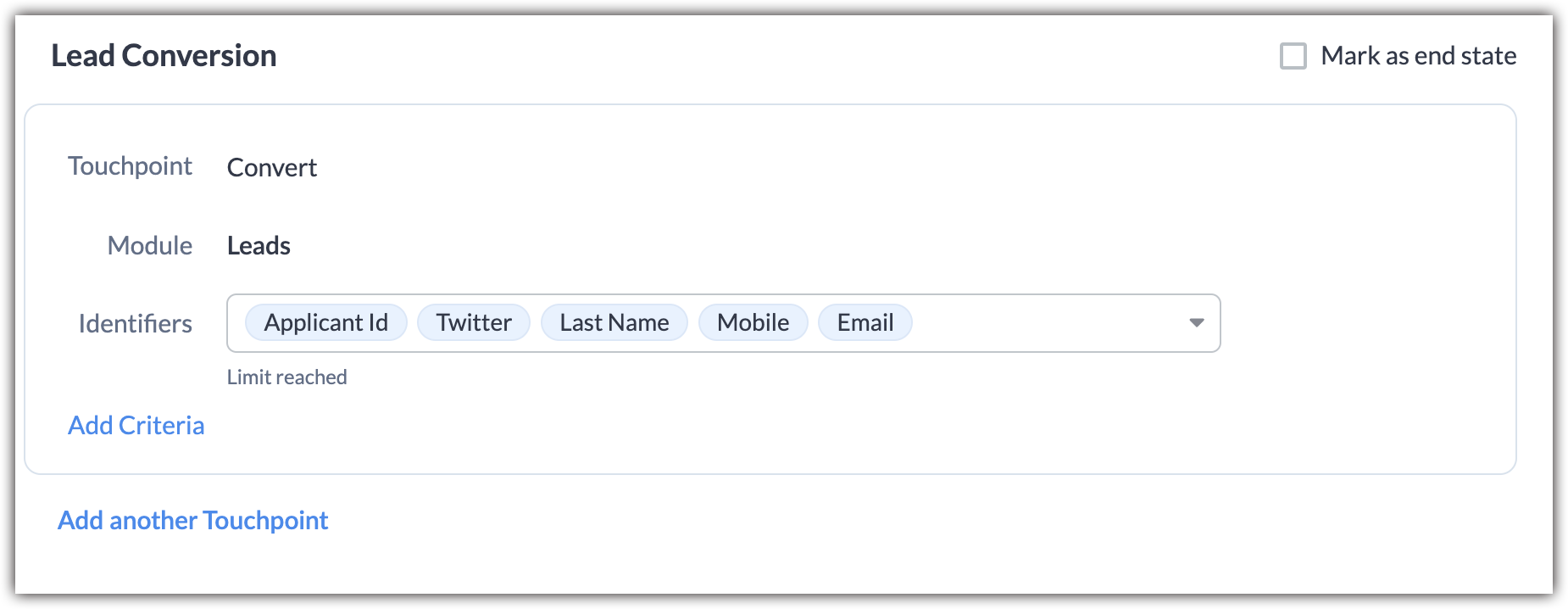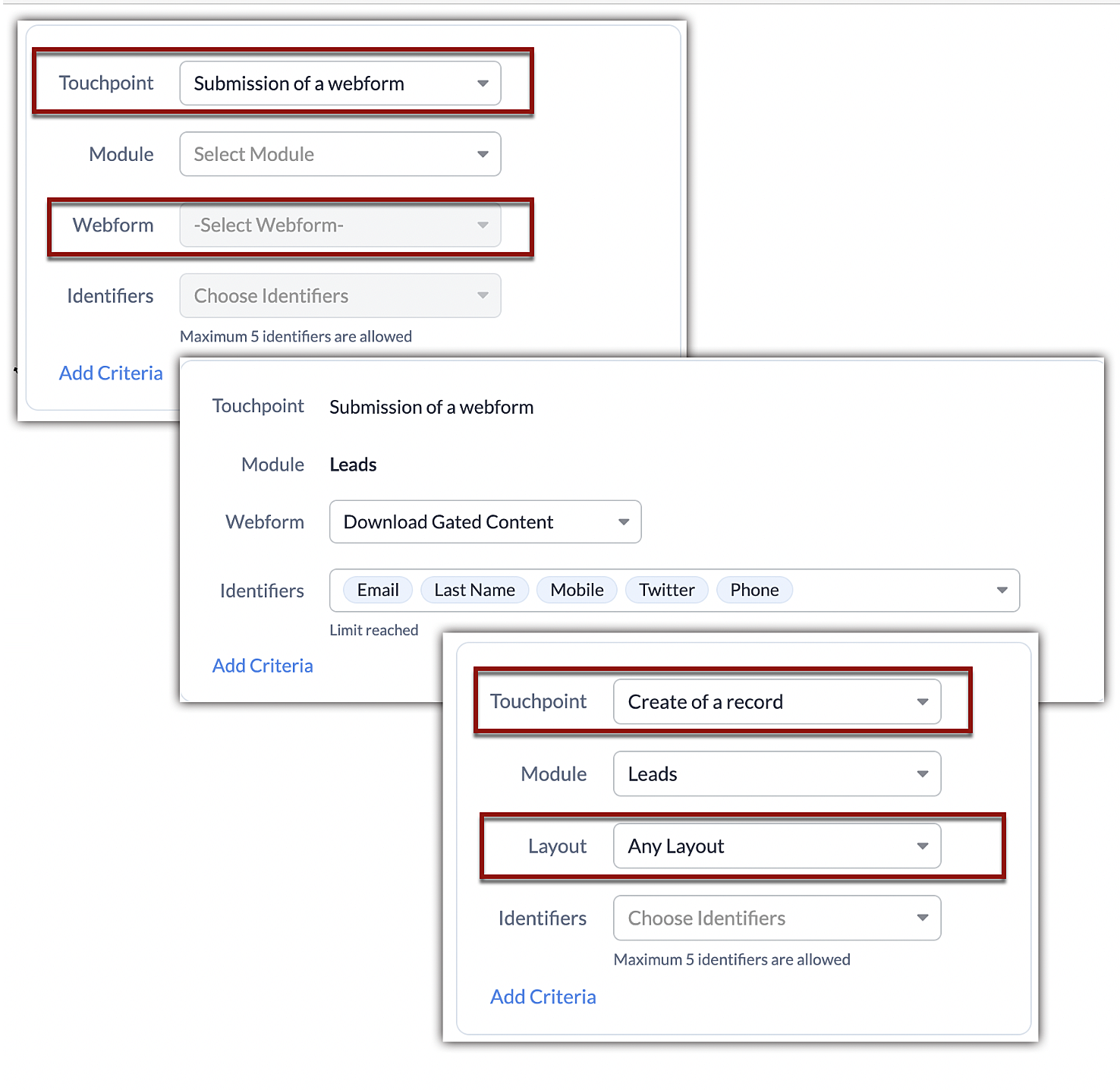 - Lead conversion is a state > Convert of a record from Leads module is a touchpoint, then the identifiers can be the same as above: Mobile, Last name, email address, phone number, and/or Record ID.