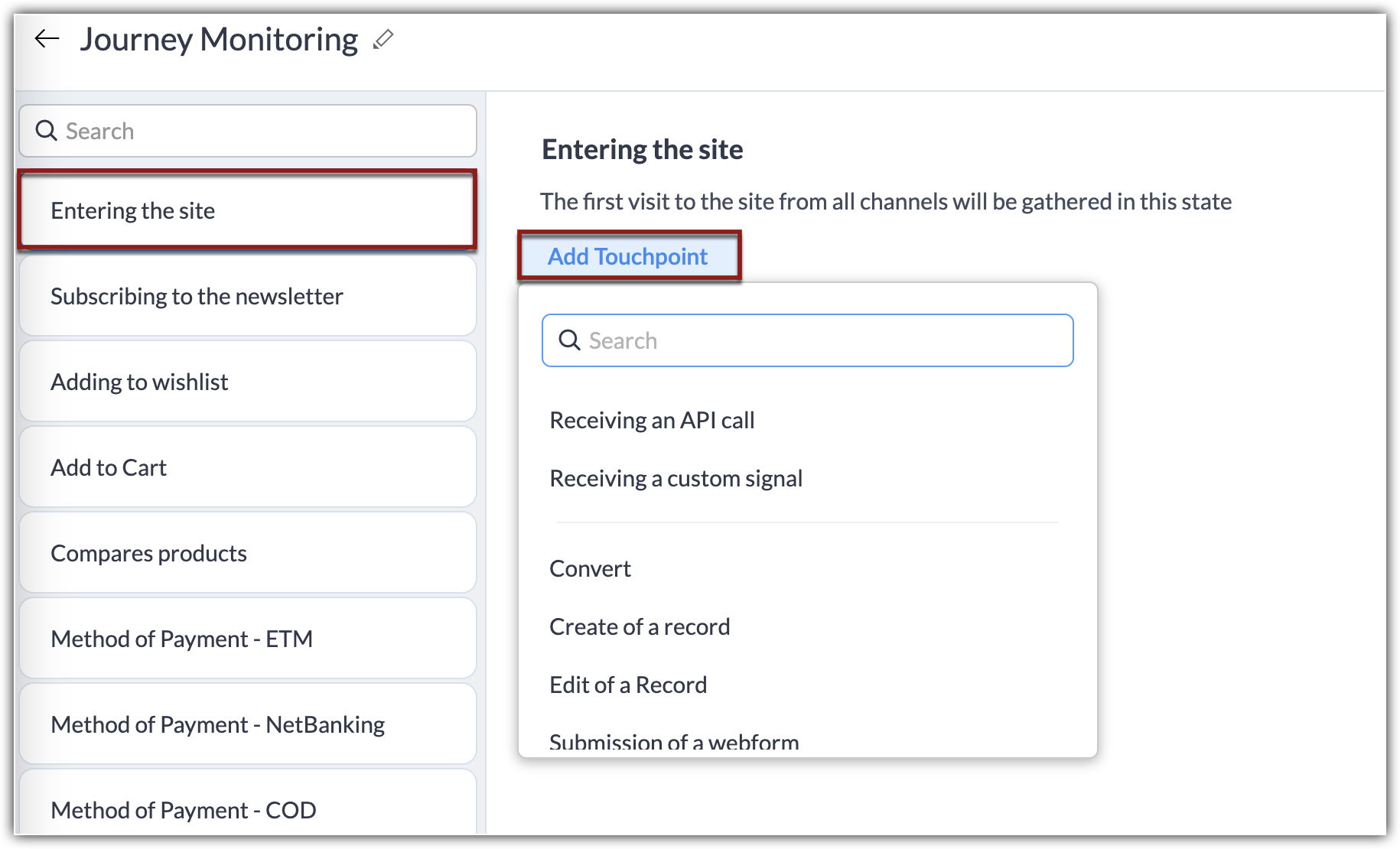 Touchpoints are module-based triggers and you can configure a touchpoint based on your objective. For example, if you determine a state for lead generation, then all lead generation activities like submission of a webform, Opening of an email, Receiving an incoming email, etc., can be configured as different touchpoints.