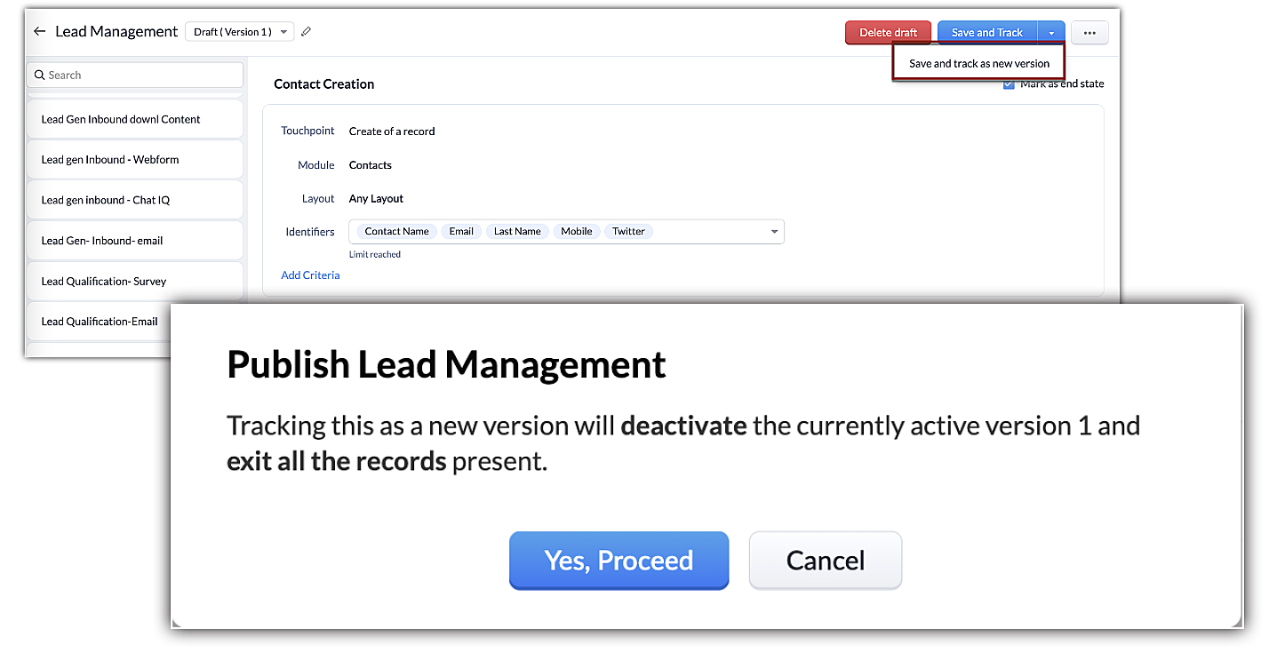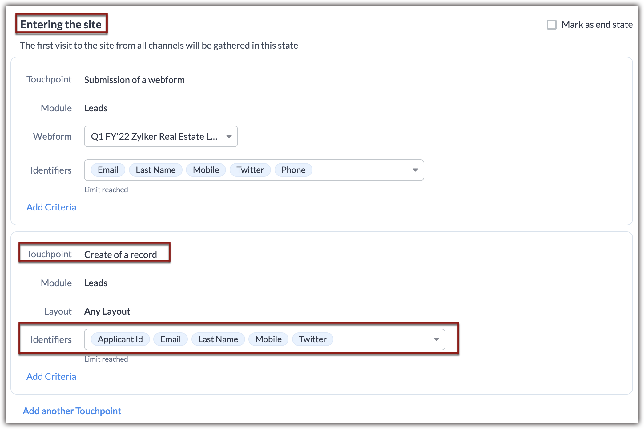 - Lead Generation is a state > Creation of a record in Leads module is a Touchpoint, then Identifiers can be Mobile, Last name, email address phone number, and/or Record ID.