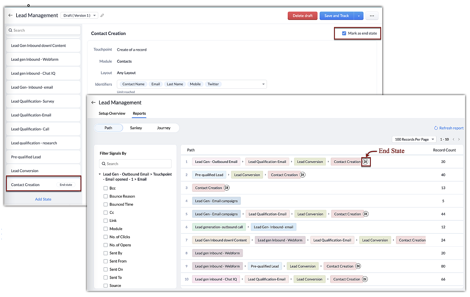 As a business, you might be aware of all the process available to create and convert leads and the touchpoints applicable at each stage. However, you might not know how these elements are being used by your users. Considering this factor, Path Finder allows you to configure up to five identifiers for each touchpoint. Based on the buyer's cycle, you can recognize the modules that might be involved with a particular state and spot the fields that could be common between two states.