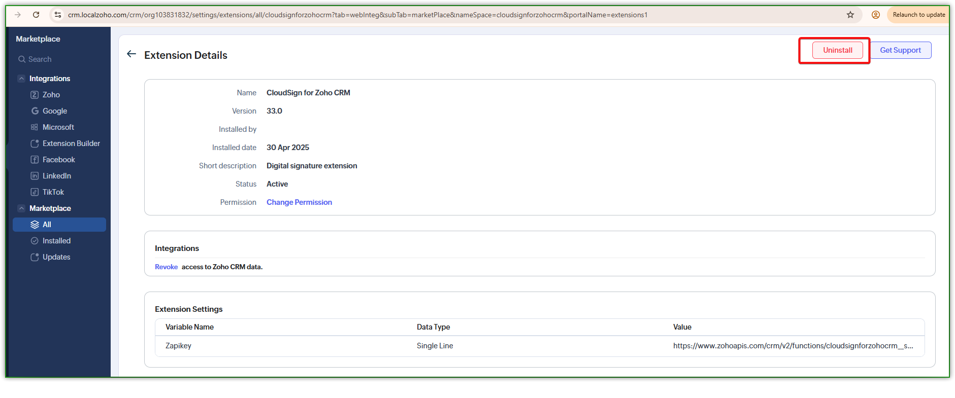 If you wish to uninstall CloudSign extension, please note that all related data will be deleted upon uninstalling and cannot be recovered.