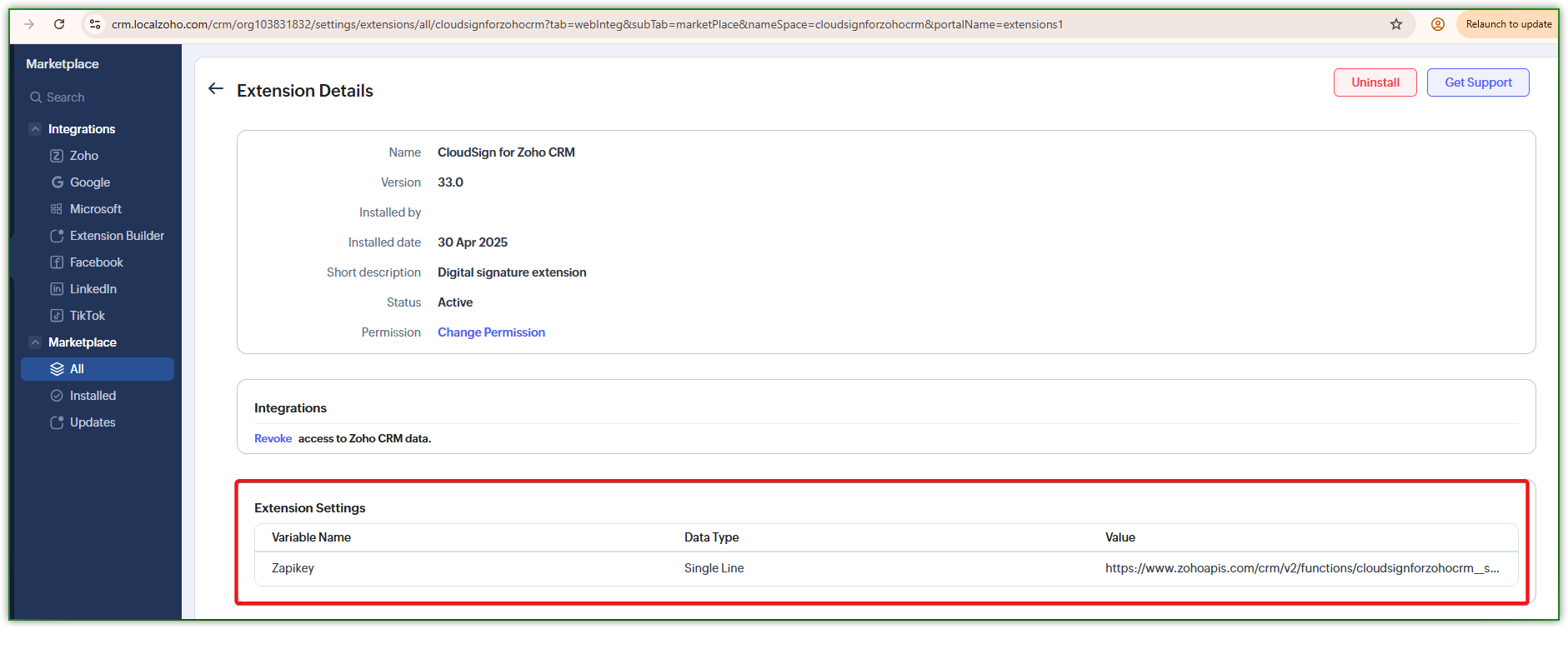 Under All Extensions, you can view all the extensions supported by your CRM. - Click All Extensions, browse for CloudSign, and click it. The details about the extension will be available.
