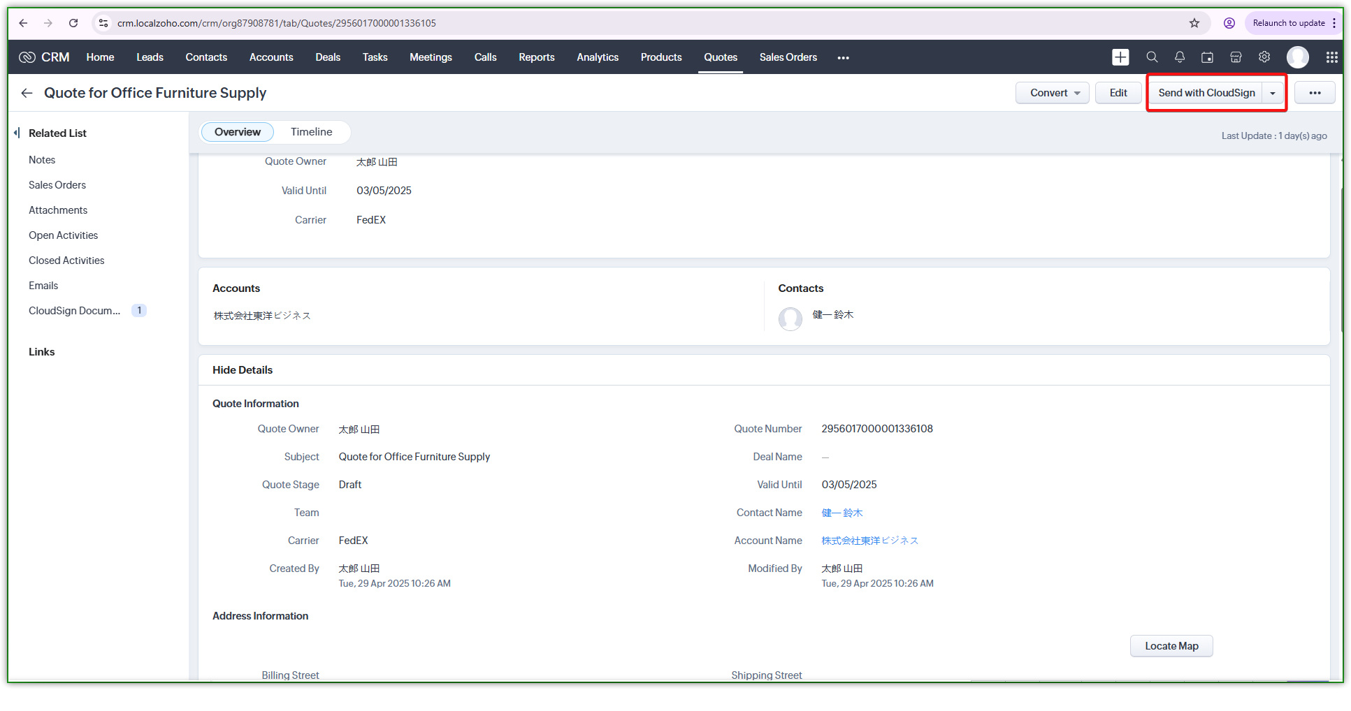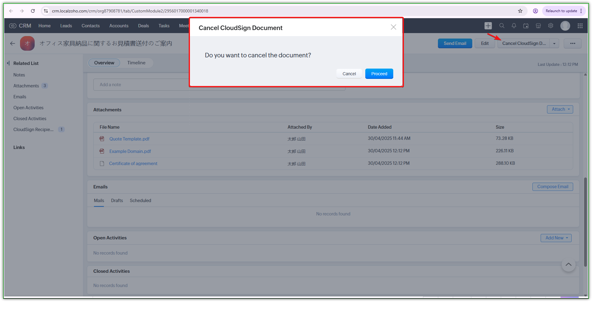 - Once the document status updated in CloudSign (e.g., Sent, Signed, Rejected), the status will automatically reflect in Zoho CRM.