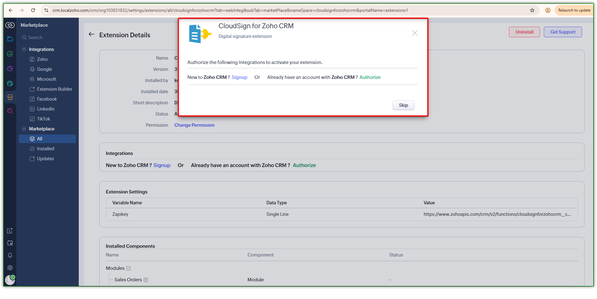 To view CloudSign documents as a related list under inventory modules, the customer must first authorize Zoho CRM. This one-time authorization allows the integration to sync and display related documents within the parent records.