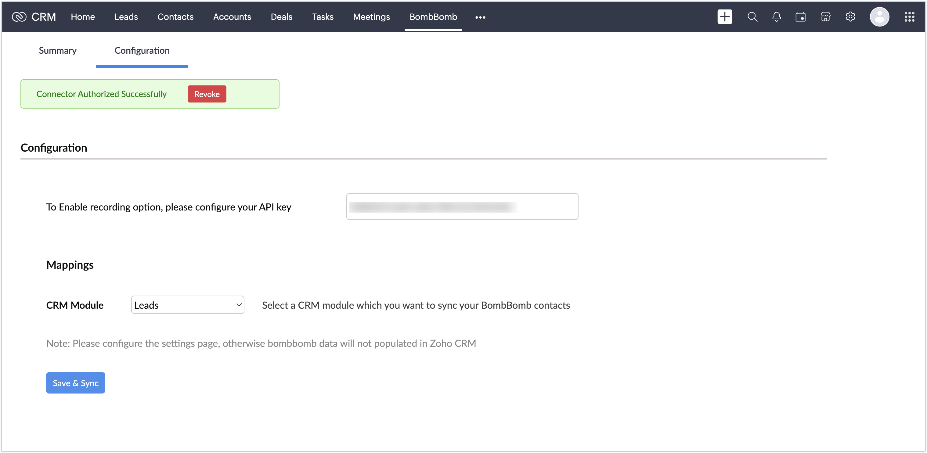 Under Mappings, select the Leads or Contacts module to which you want to sync your BombBomb contacts.