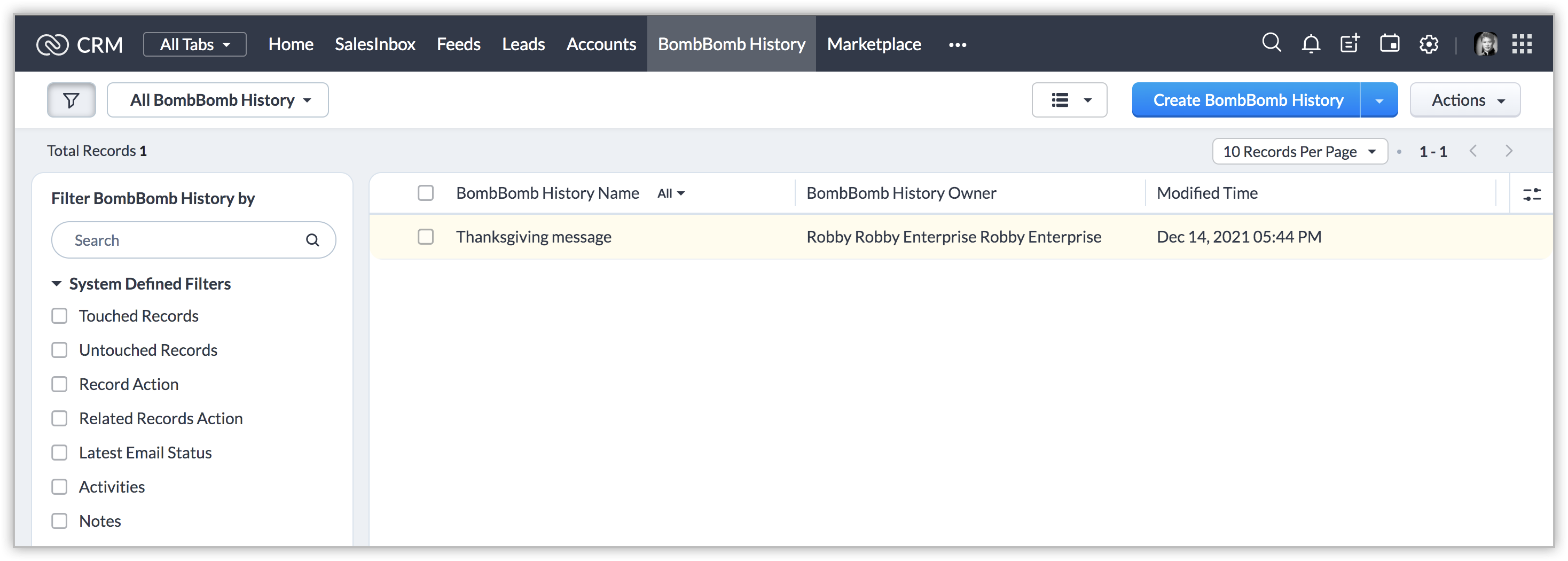 The selected video messages will be sent to the recipients, and the details will be added as a record to the BombBomb History module.