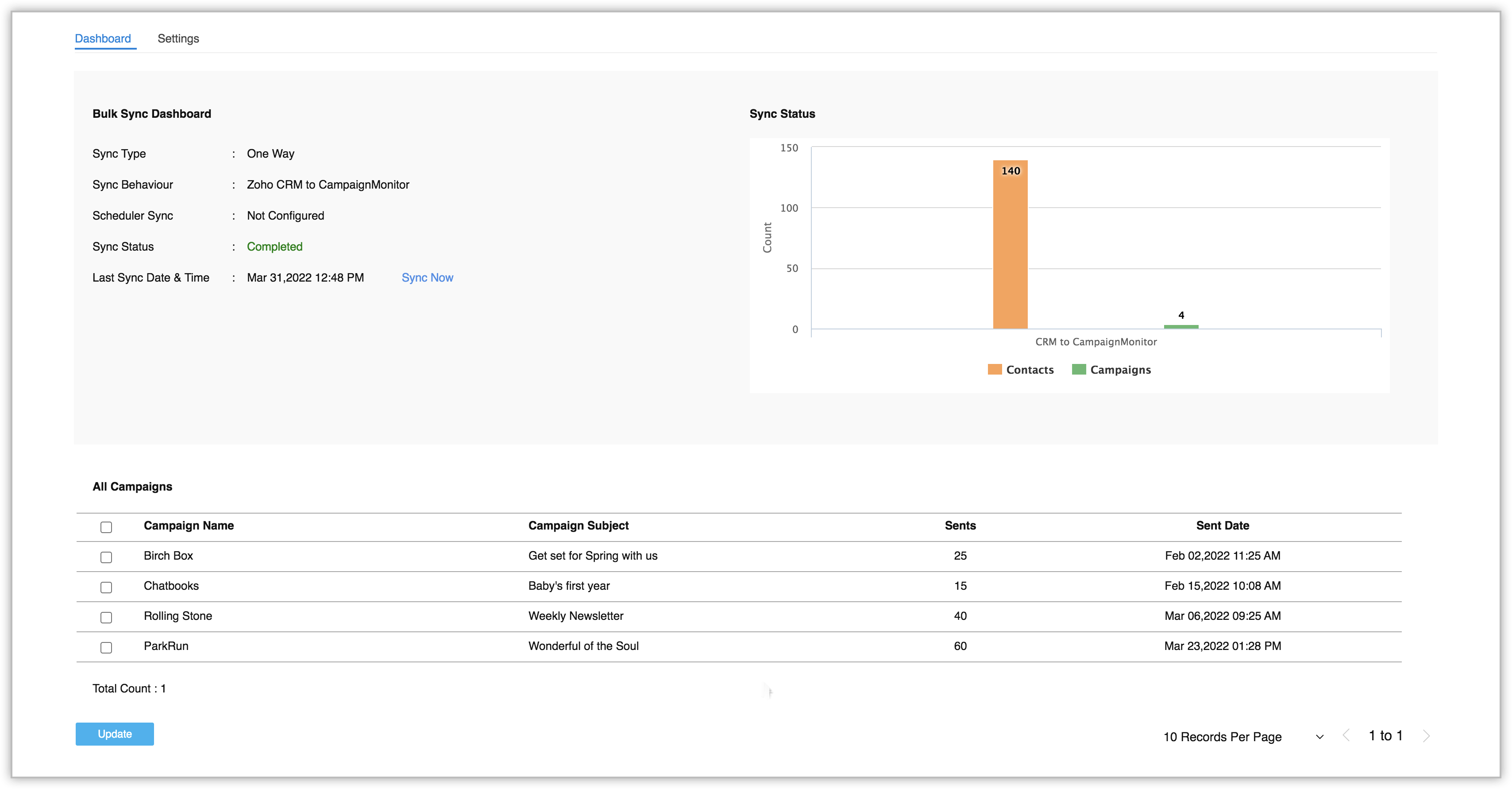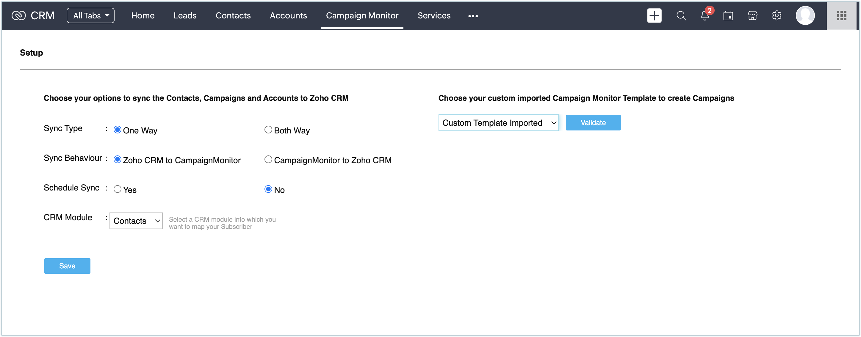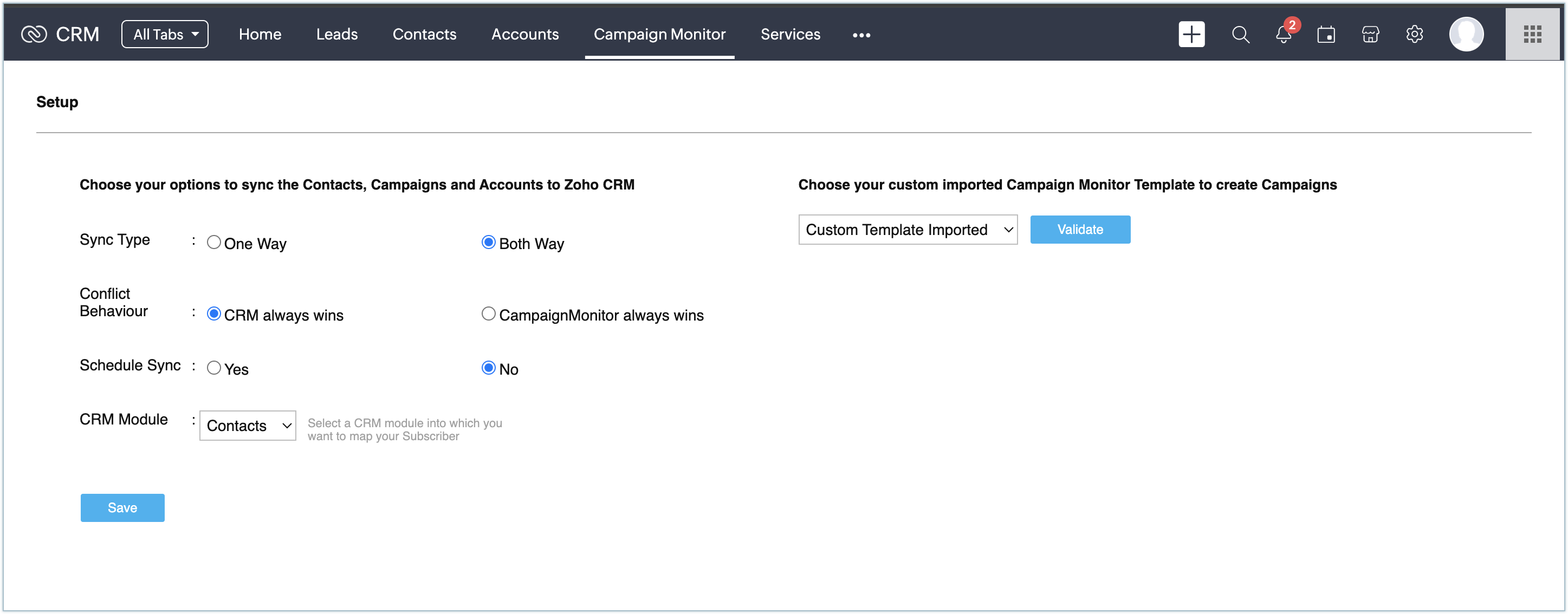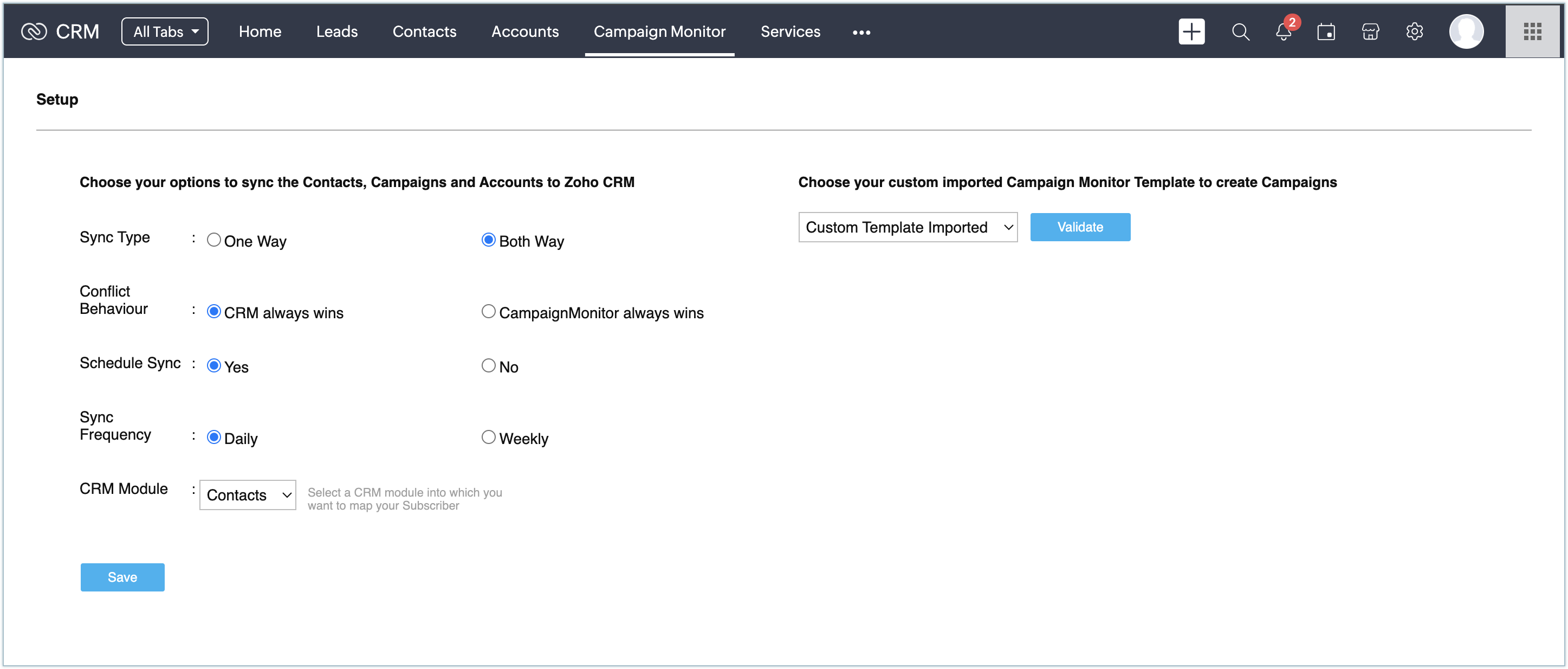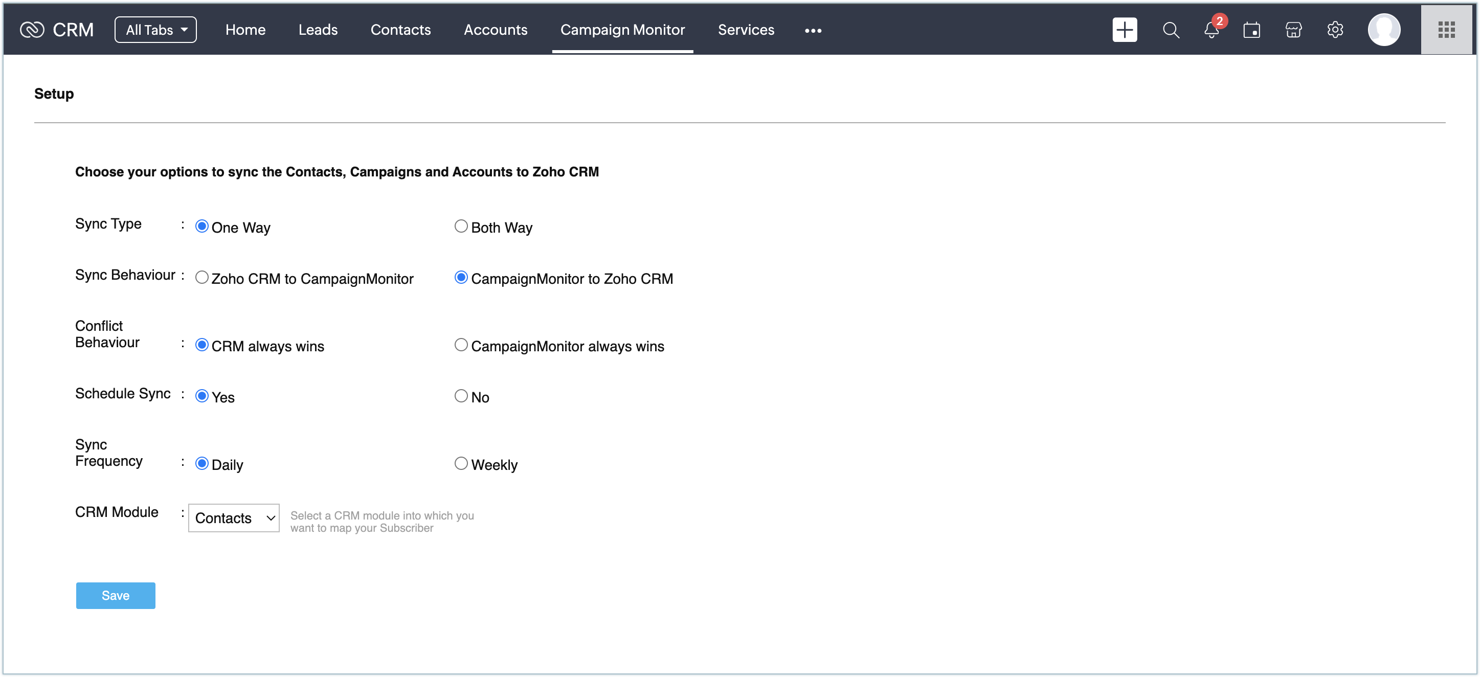 Once the extension is installed and configured, a Campaign Monitor web tab will be created in your Zoho CRM. You can establish sync settings within this tab. Based on your settings, synchronization will occur in real time. Your settings can be modified at any time.