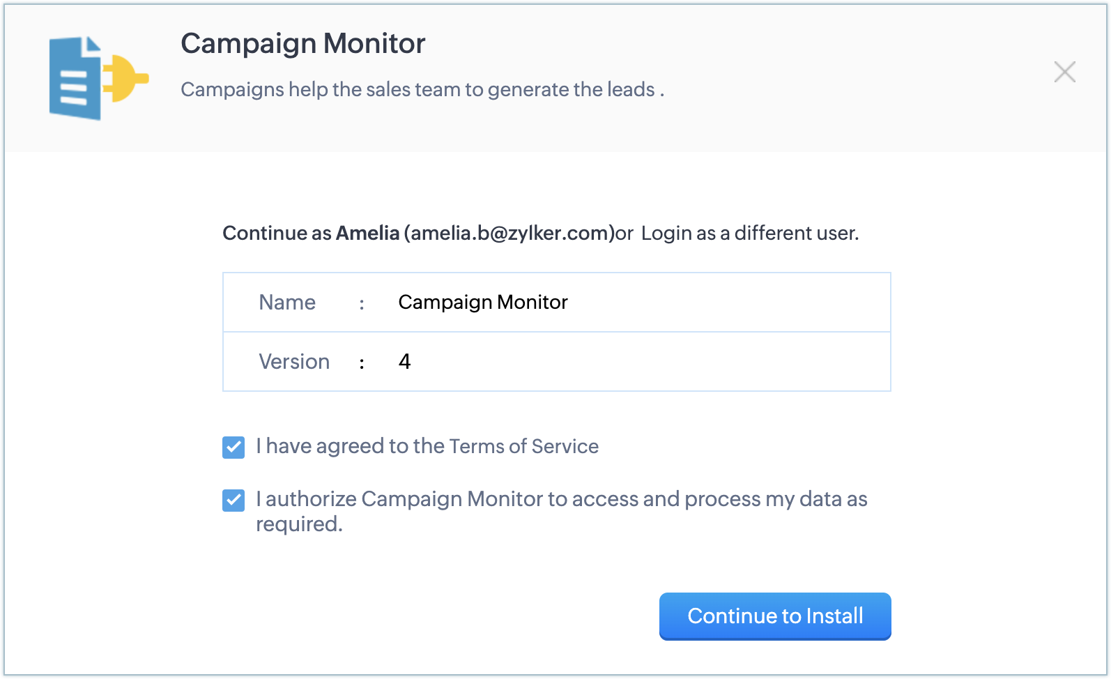 You can install the Campaign Monitor extension either from Zoho Marketplace or from within your Zoho CRM account as follows:
