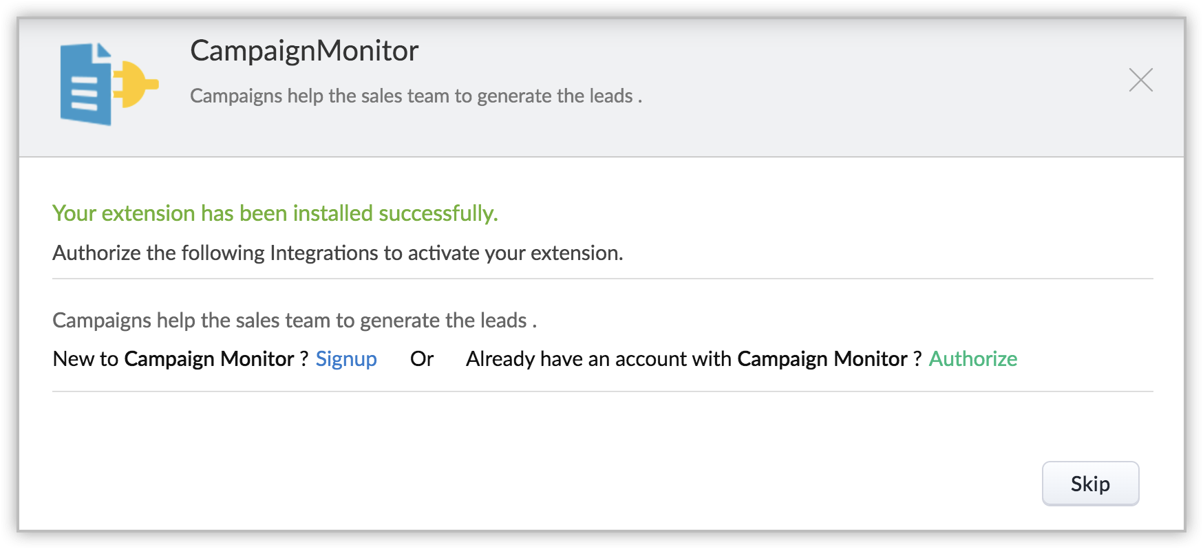 If you skip this step, you can authorize later from your Setup page in Zoho CRM. To do so, go to Setup > Marketplace > All. Find the Campaign Monitor extension and click Configure.