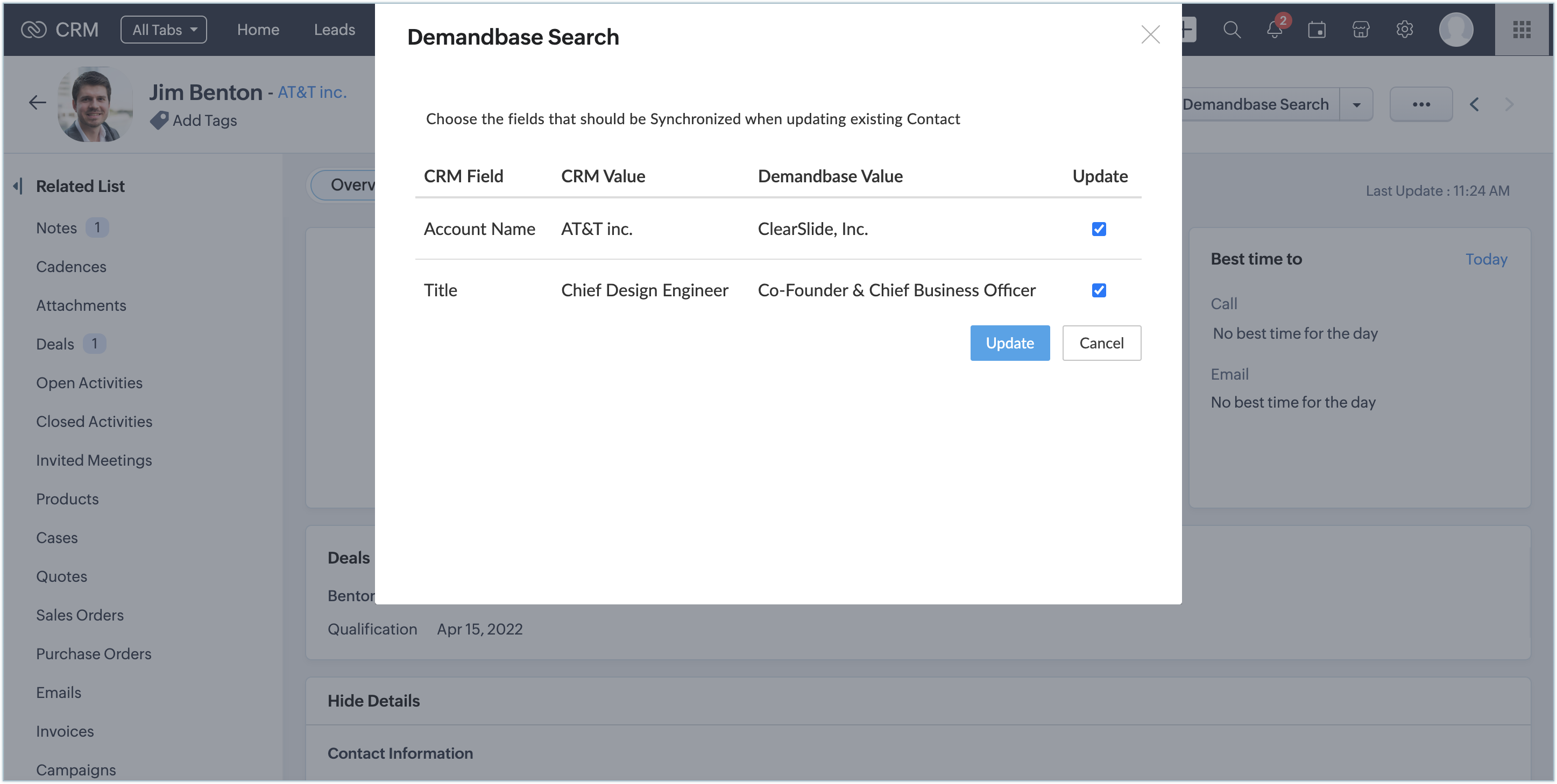The contact details (subscribed fields) added to the Zoho CRM will be updated periodically. The contact details can also be updated manually if required as follows.
