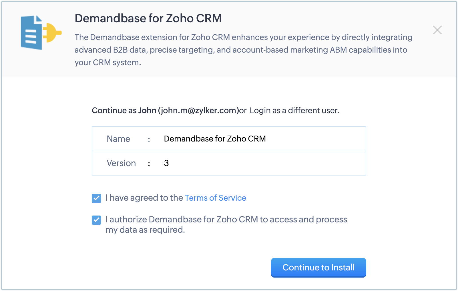 Note: If you skip this step, you can provide the details later from your Setup page in Zoho CRM. To do so, go to Setup > Marketplace > All. Find the Demandbase extension and click Configure.