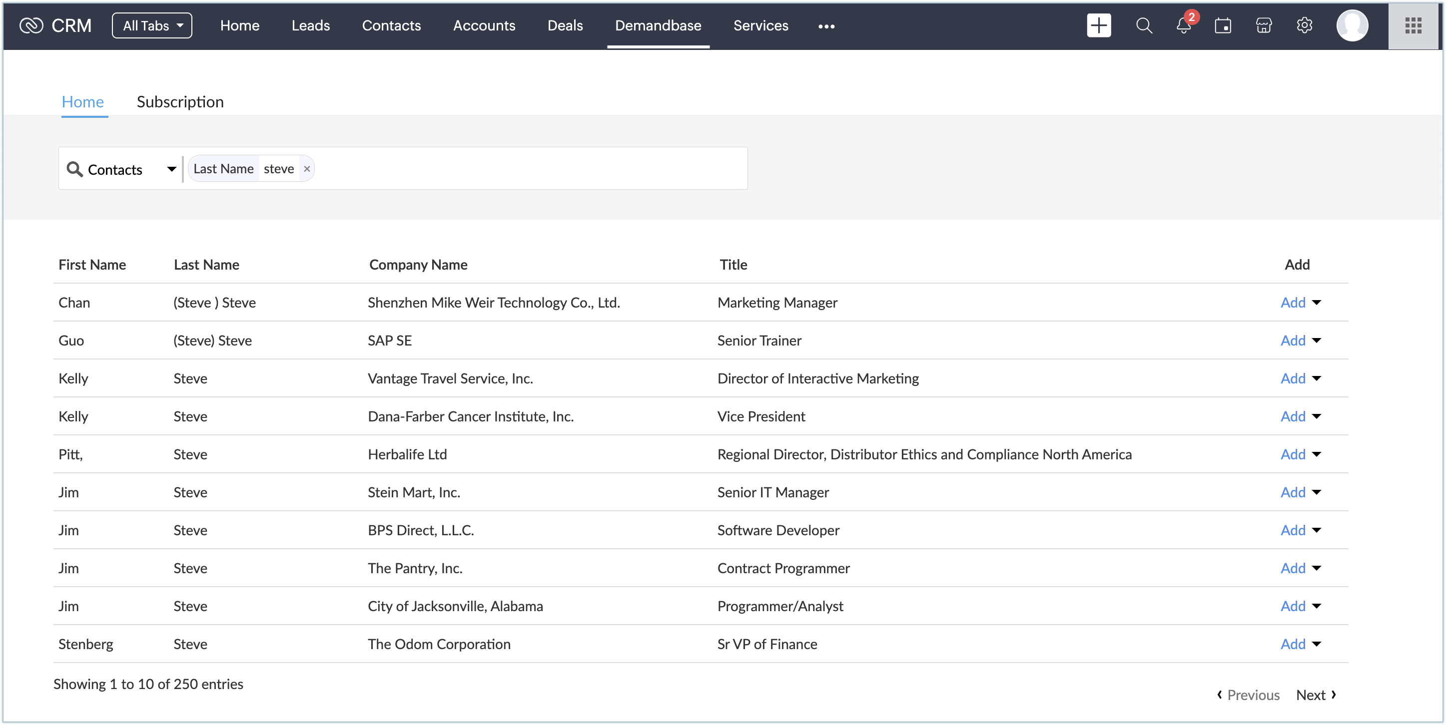 1. Add - Entries searched under companies will get added to the Accounts module, whereas under contacts, it goes into the Contacts module.
