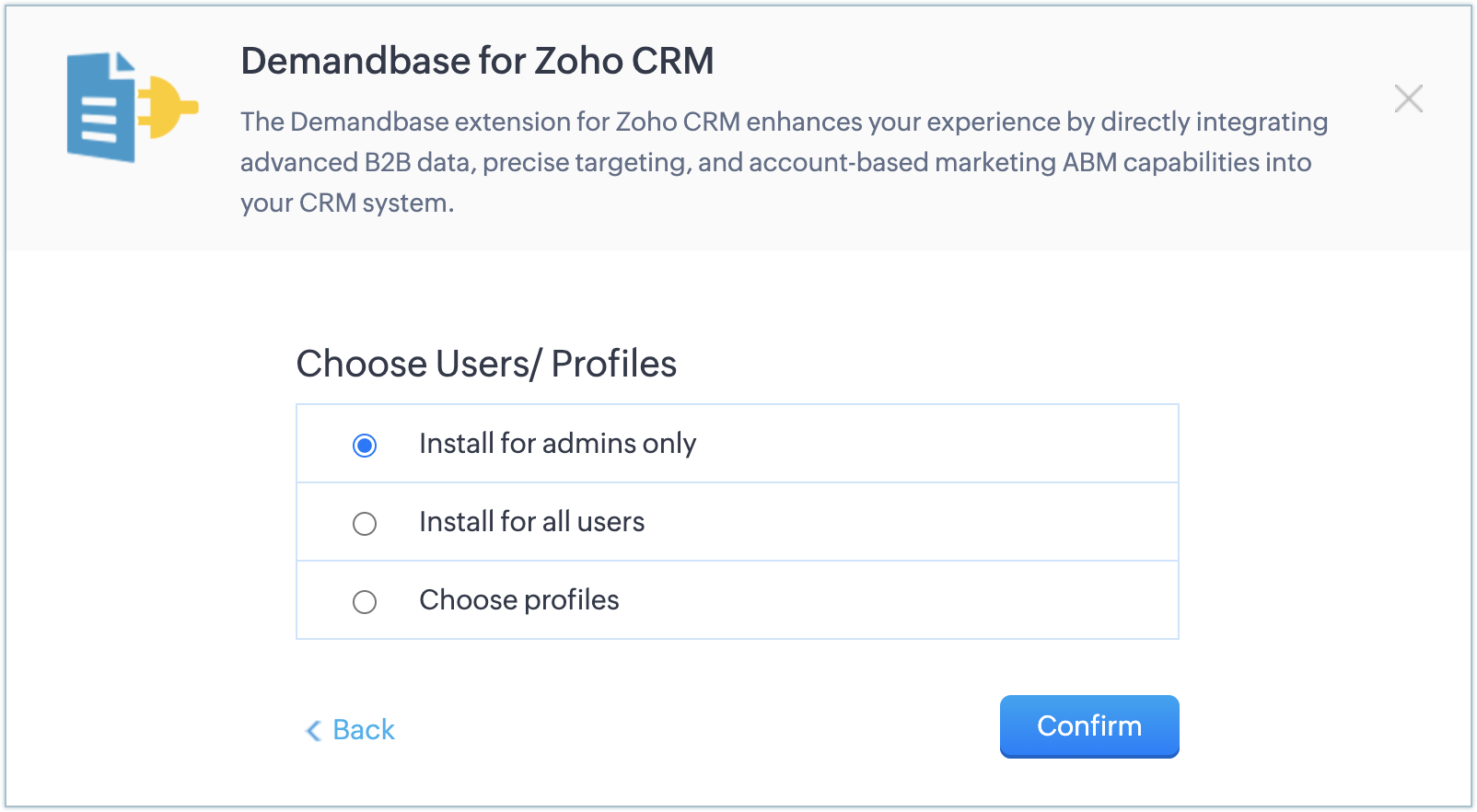 You can install the Demandbase extension either from Zoho Marketplace or from within your Zoho CRM account as follows: