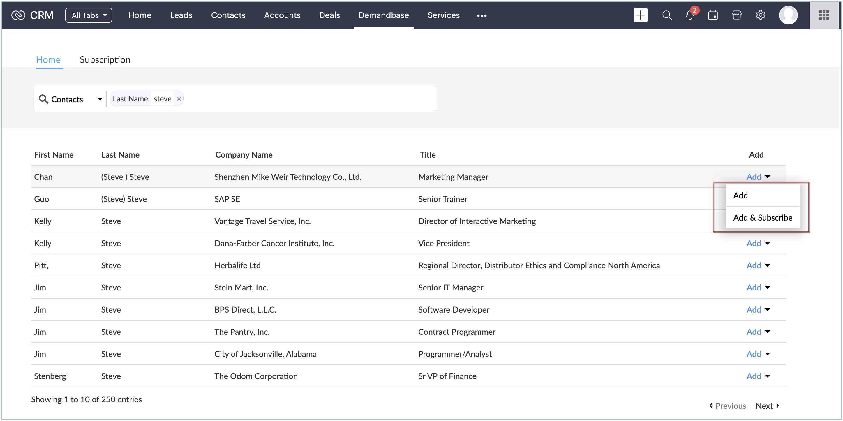 2. Add & Subscribe - The selected entries along with the subscribed fields will be added to either the contacts or accounts module in Zoho CRM, respectively.