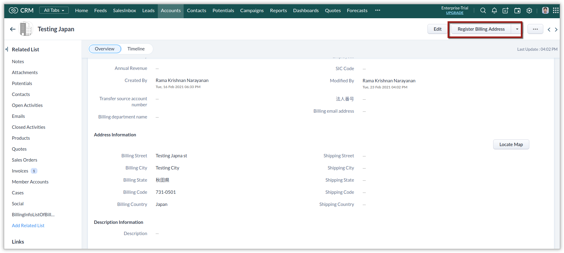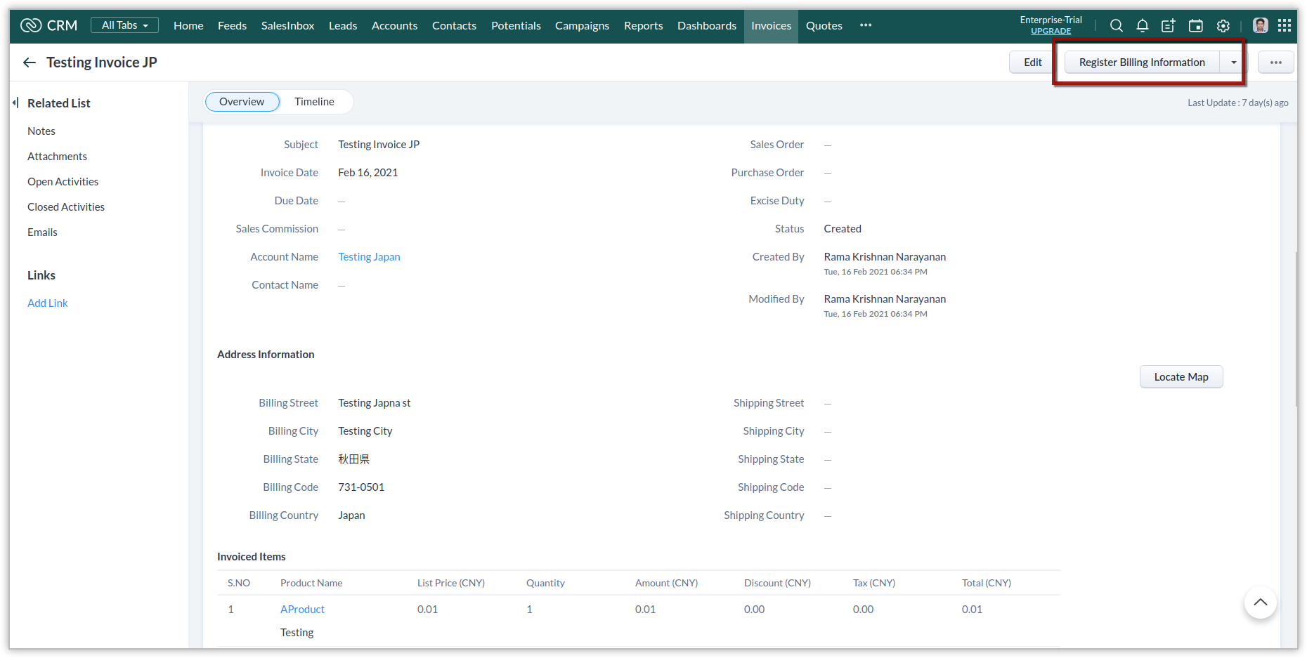 The invoices created in Zoho CRM must be associated with an account to export. To associate an invoice, a billing address must be registered with the account. The same address can be registered with the invoice and exported to Seikyu Kanri Robo Payment.  To export an invoice: