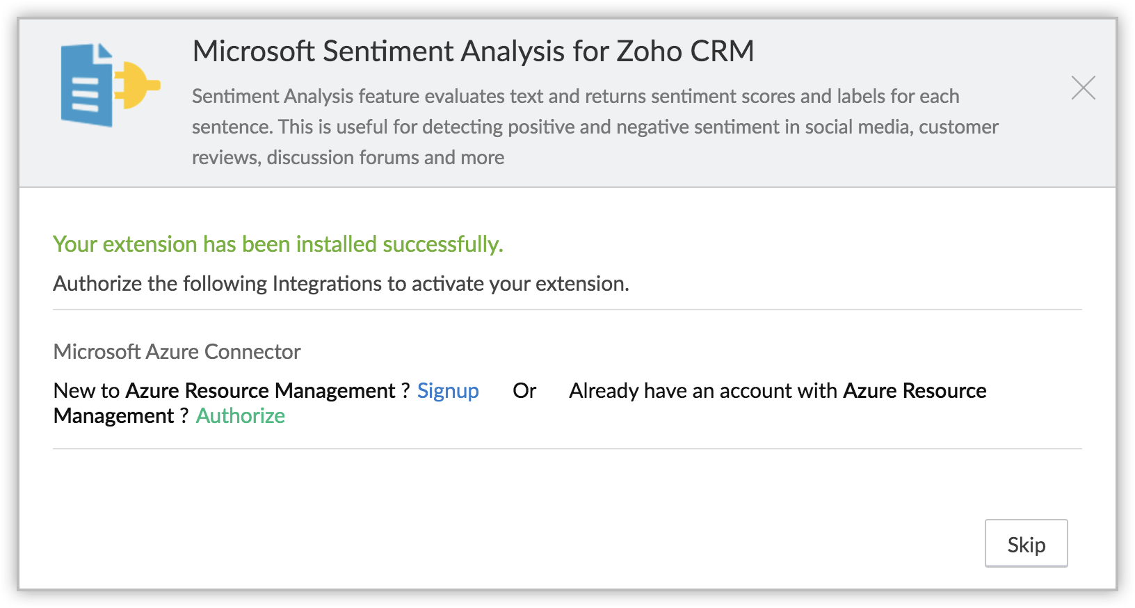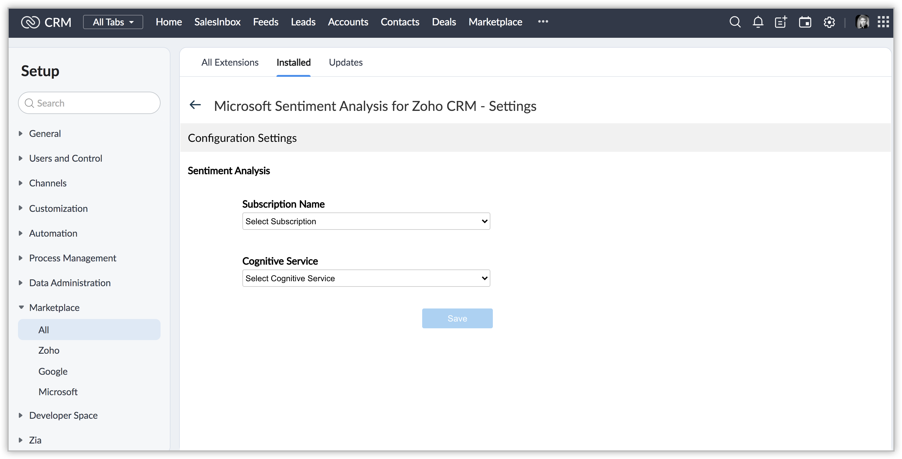 1. If you skip this step, you can authorize it later from your Setup page in Zoho CRM. To do so, go to Setup > Marketplace > All. Find the Microsoft Sentiment Analysis extension and click Configure.