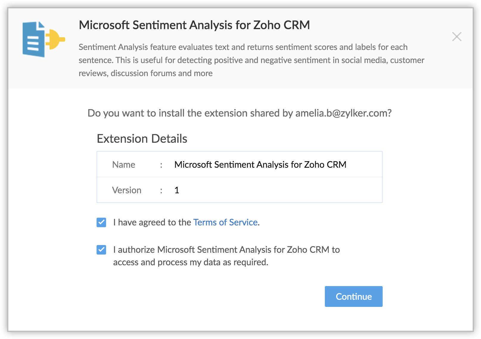 You can install the  Microsoft  Sentiment Analysis extension either from Zoho Marketplace or from within your Zoho CRM account as follows: