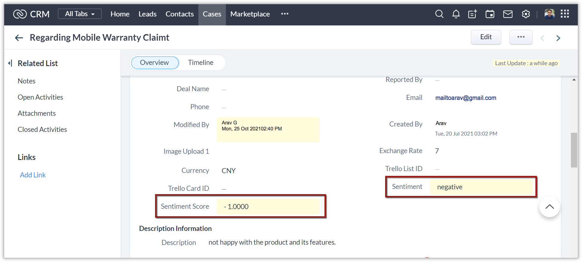 The Microsoft Sentiment Analysis extension for Zoho CRM analyzes and scores the sentiments of each customer's comments, helping salespeople know whether the client is happy or sad throughout the engagement. This feature evaluates text and returns sentiment scores for the comment, making it ideal for detecting positive and negative sentiment in customer reviews, social media comments, discussion forums, and more.