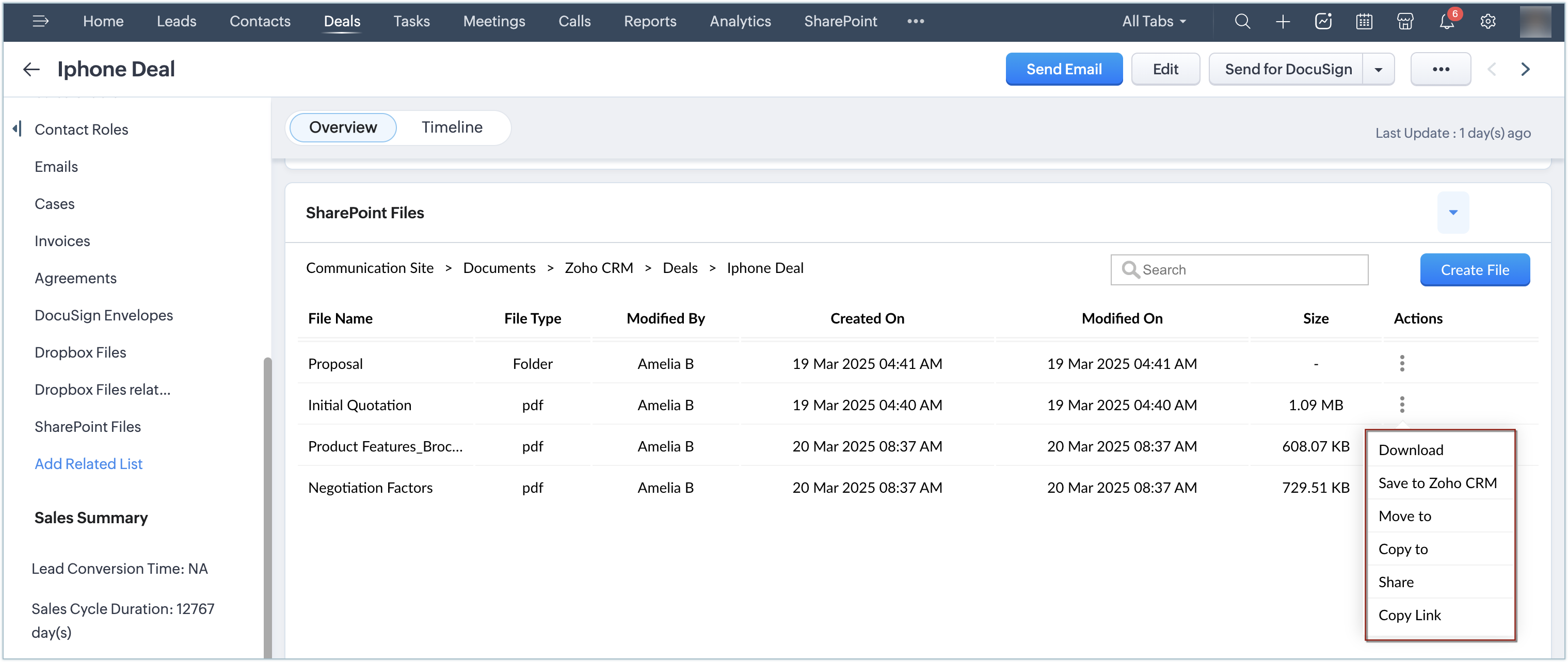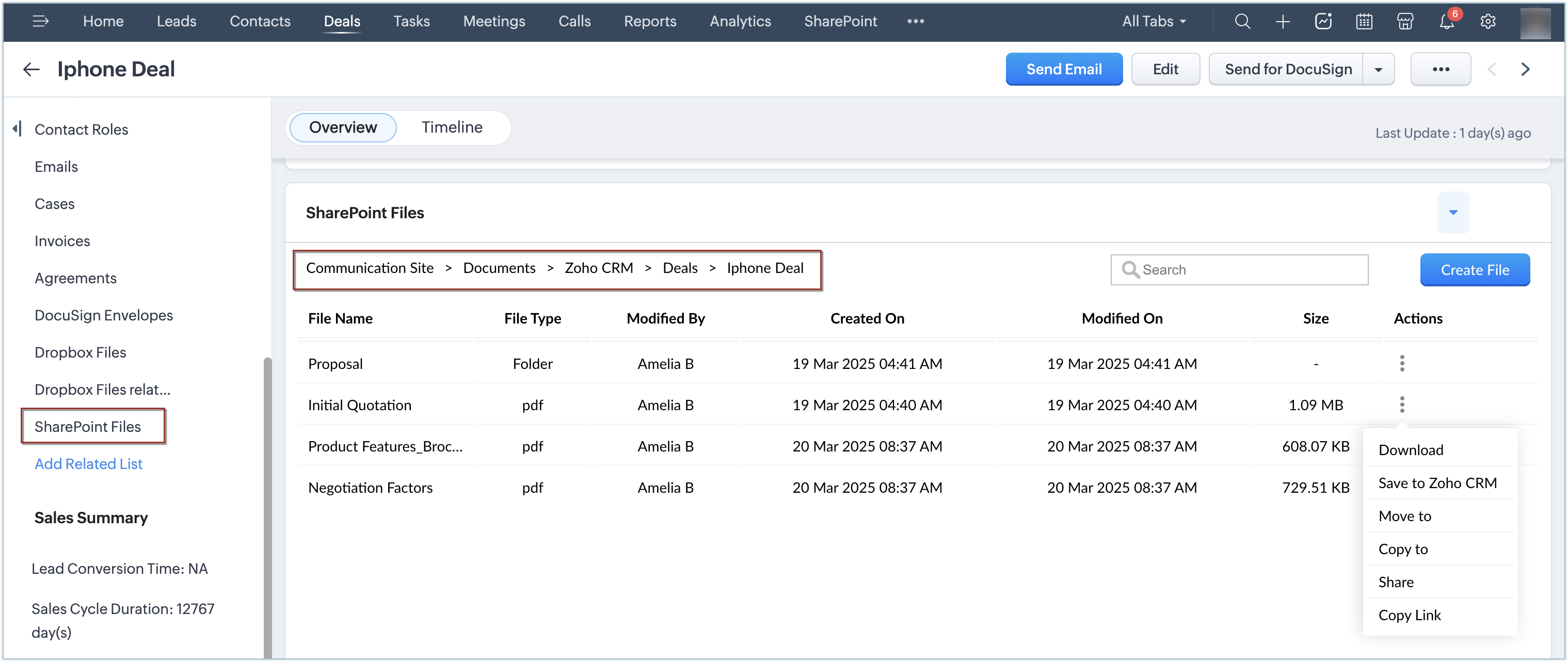 While the data sync brings in SharePoint data to Zoho CRM, you can also create files and folders in SharePoint from within Zoho CRM.