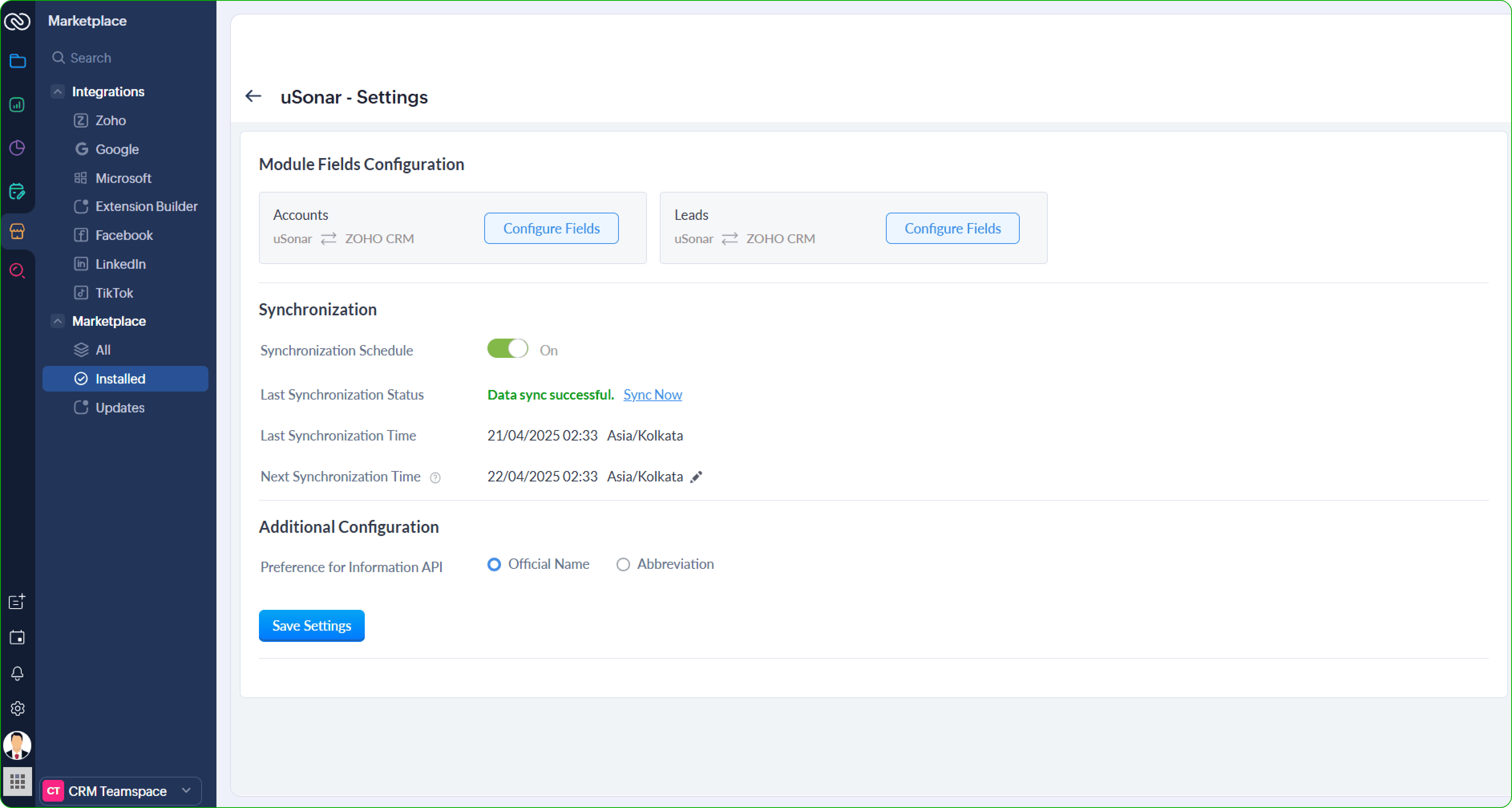 If the scheduler is enabled, the system will automatically update information in Zoho CRM whenever changes are made in uSonar. For example, if Company A has already been synced to Zoho CRM and certain fields are later updated in uSonar, the scheduler will detect these changes and sync the updated data to Zoho CRM automatically.