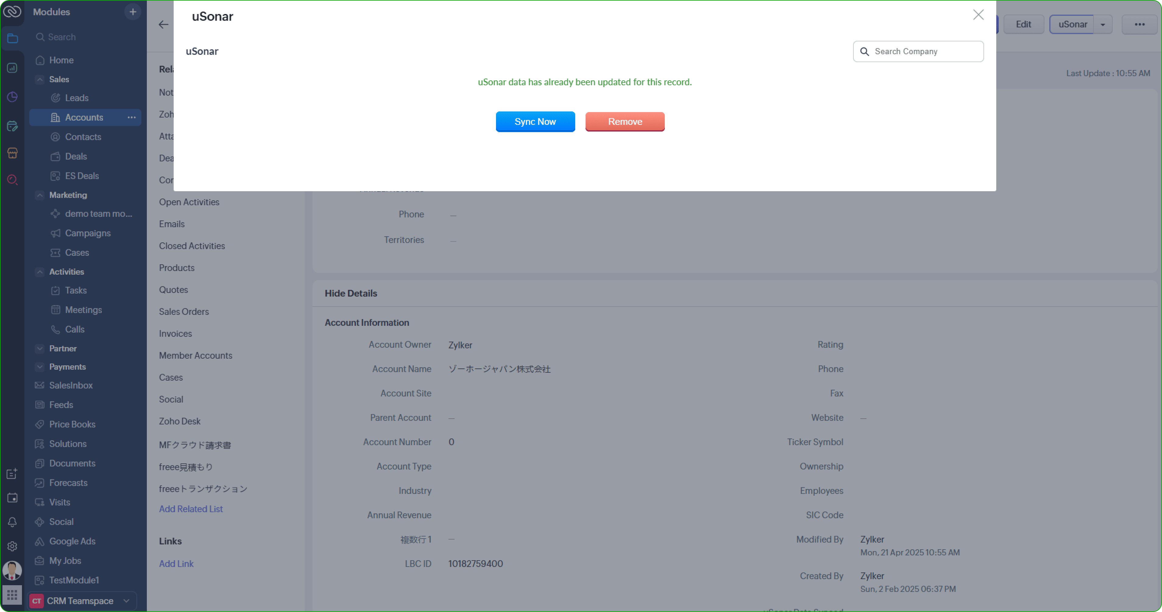 Administrators also have the option to manually sync the latest company data by clicking Sync Now, which updates previously synced records with the most recent information from uSonar.