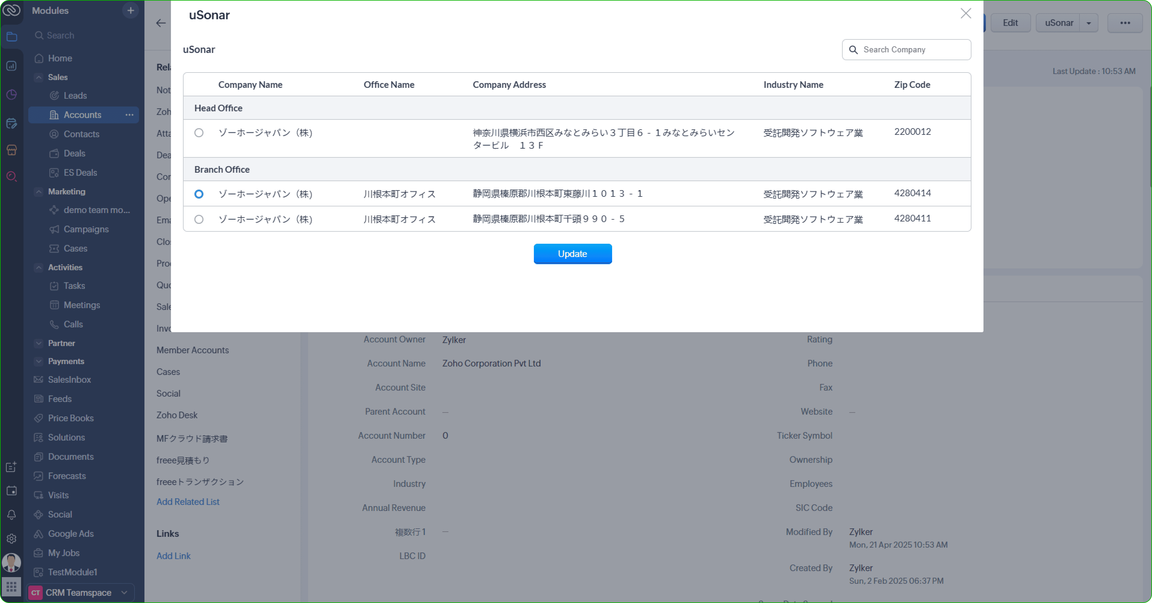 Select the appropriate company from the list and click Update to sync its details with the current Zoho CRM record.