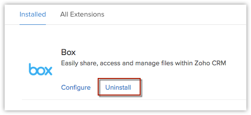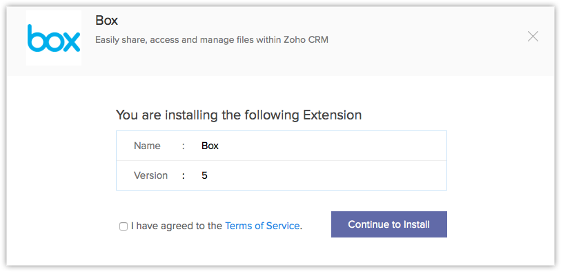 You can either go to the  Zoho Marketplace and install the Box extension or log in to your Zoho CRM account and install.