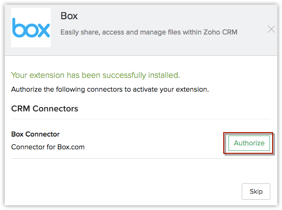 Note: Please note that the Box extension for Zoho CRM is available in US, EU, IN, CN, AU, CA, and JP datacenters.