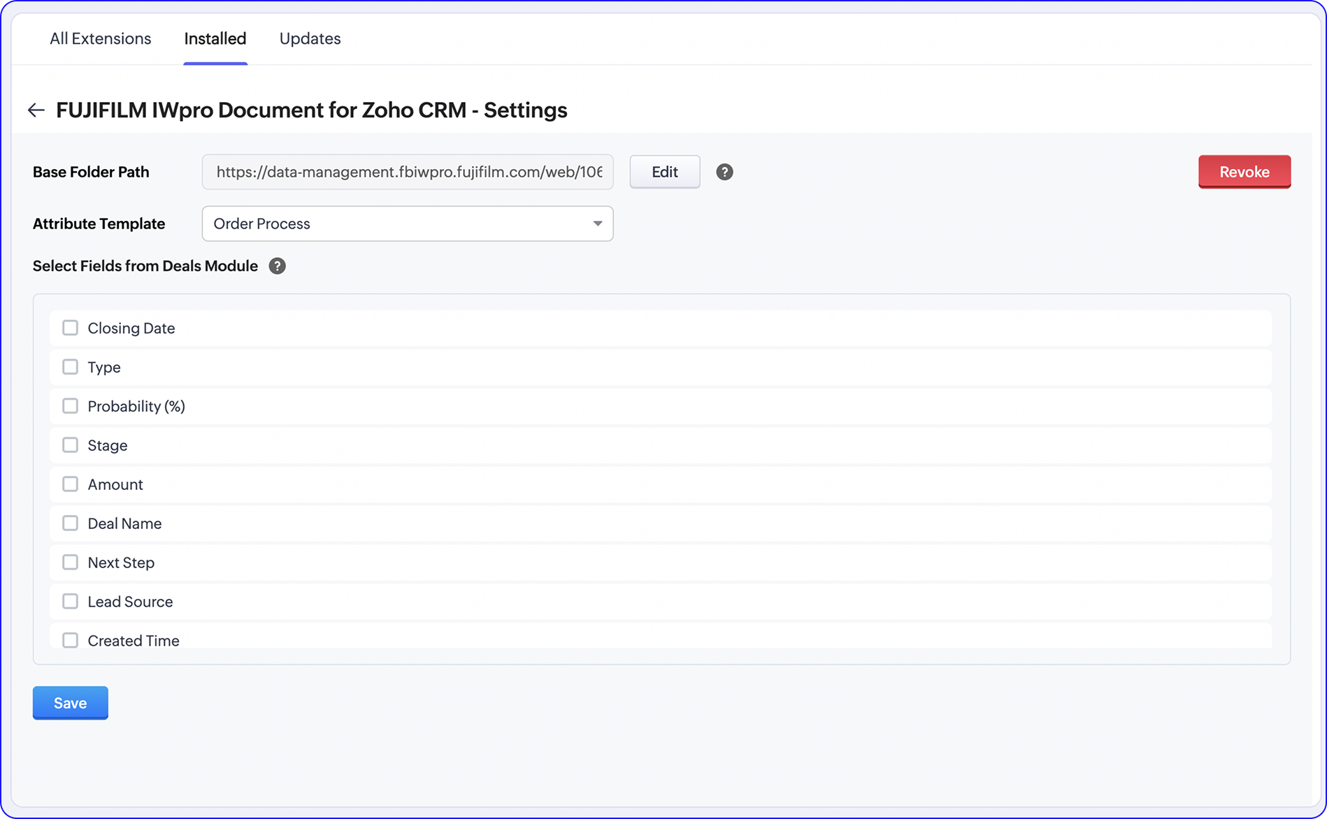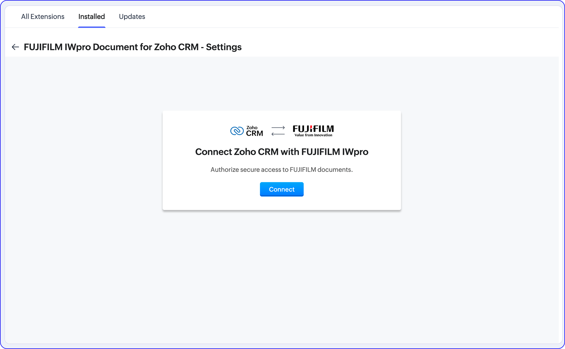 Once installed, the extension settings page will be available under Setup > Marketplace > All > Installed > FUJIFILM IWpro Document for Zoho CRM.