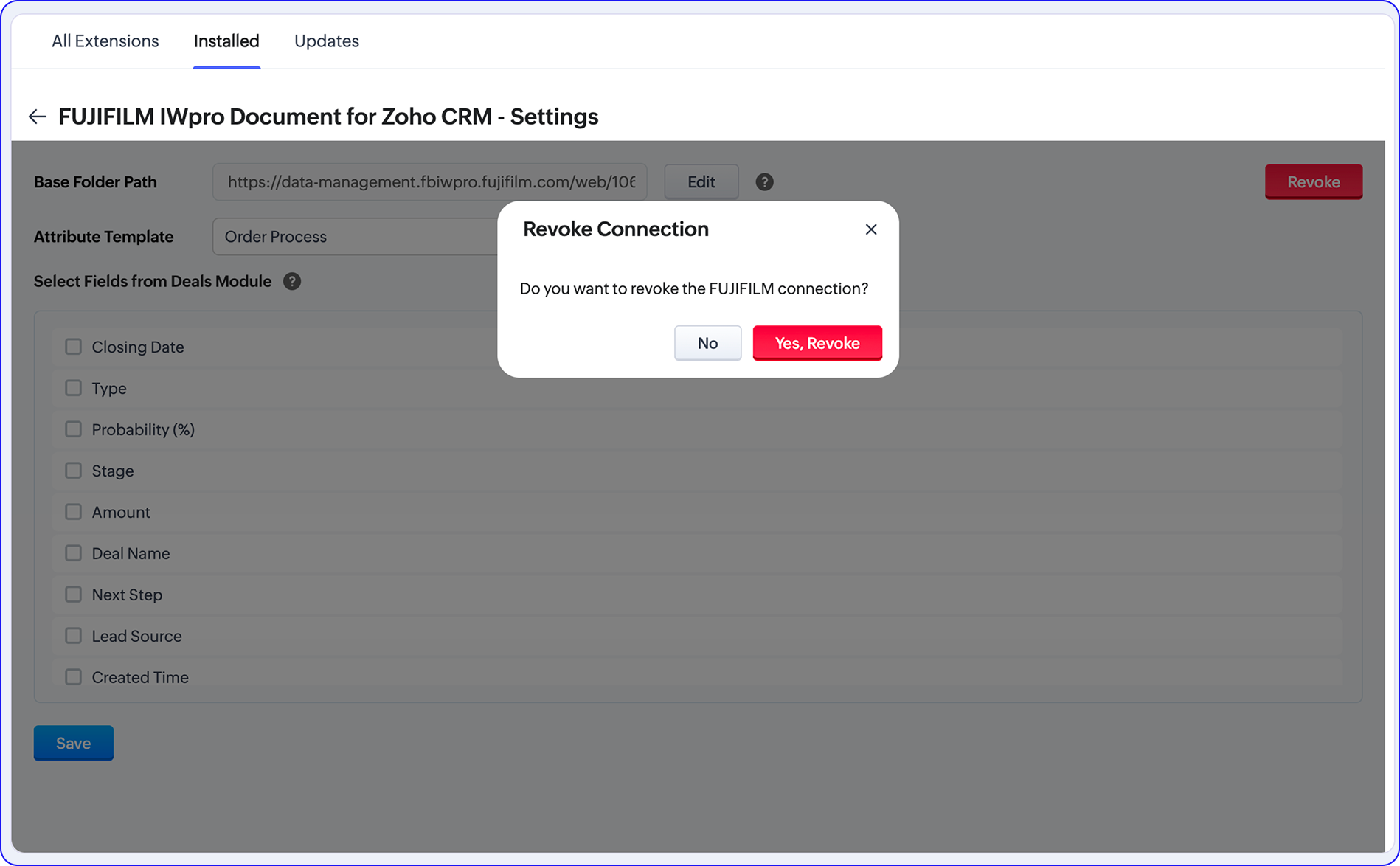 Warning 2: The extension automatically creates a custom field called "FUJIFILM Folder ID" in both the Accounts and Deals modules during installation. No manual field creation is required.