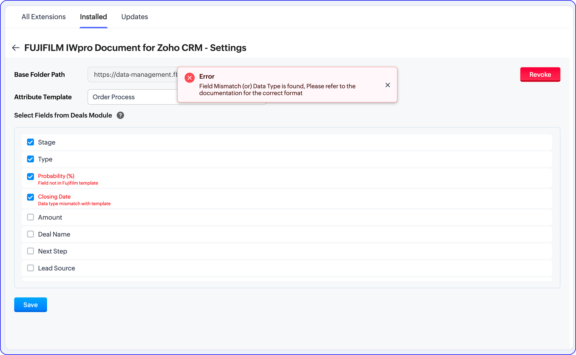- If a user selects a Zoho CRM Deal field that is not created or mapped in FUJIFILM IWpro, an alert message will be displayed.