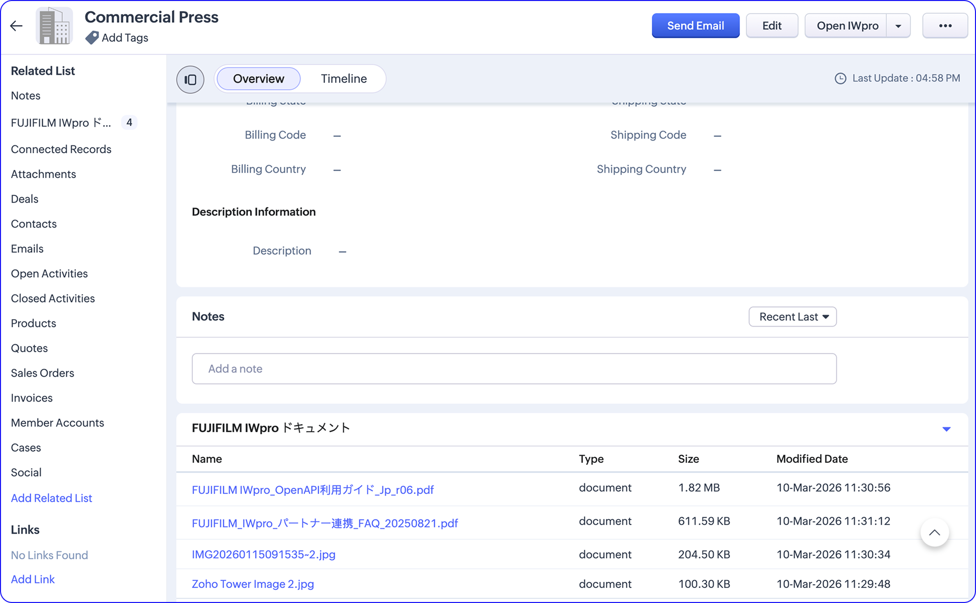 The extension provides a Related List widget in both account and deal records, allowing you to view and access all documents stored in FUJIFILM IWpro without leaving Zoho CRM.