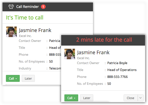 Get reminded of the call that you need to make. In the middle of something? Drafting an email or in a discussion or on another call that extented for a few more minutes? Snooze the reminder and call later.