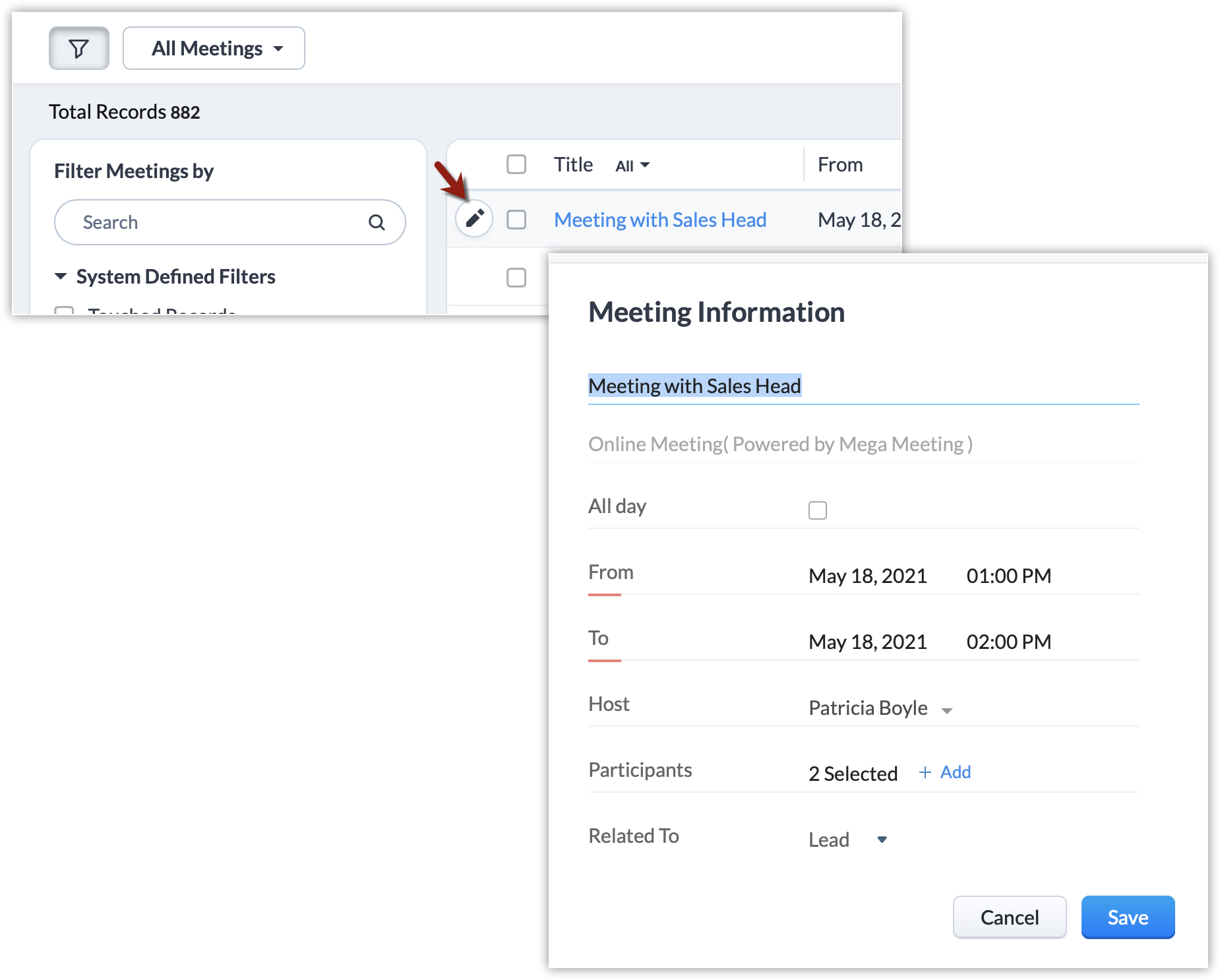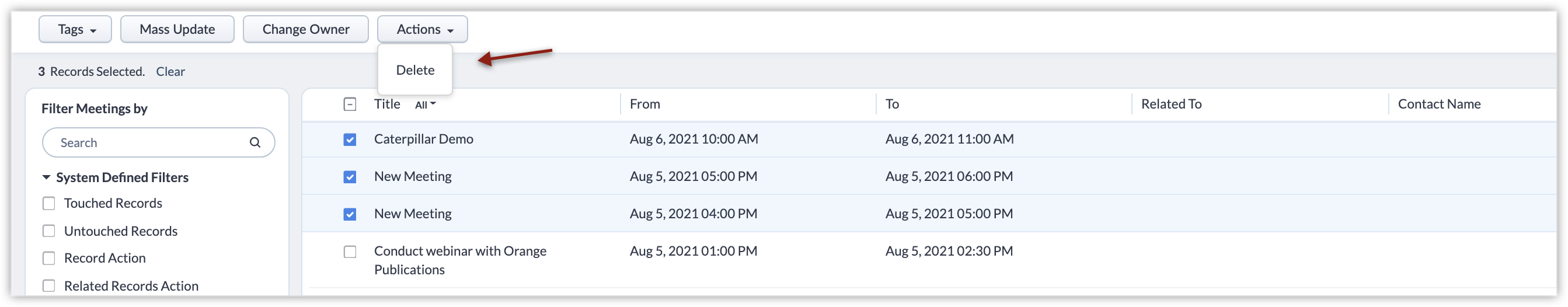You can also create new sharing rule to customize the record sharing criteria in case you want a few users to view the records. To view the meetings, go to meetings module and click on All meetings list view on the meetings home page.