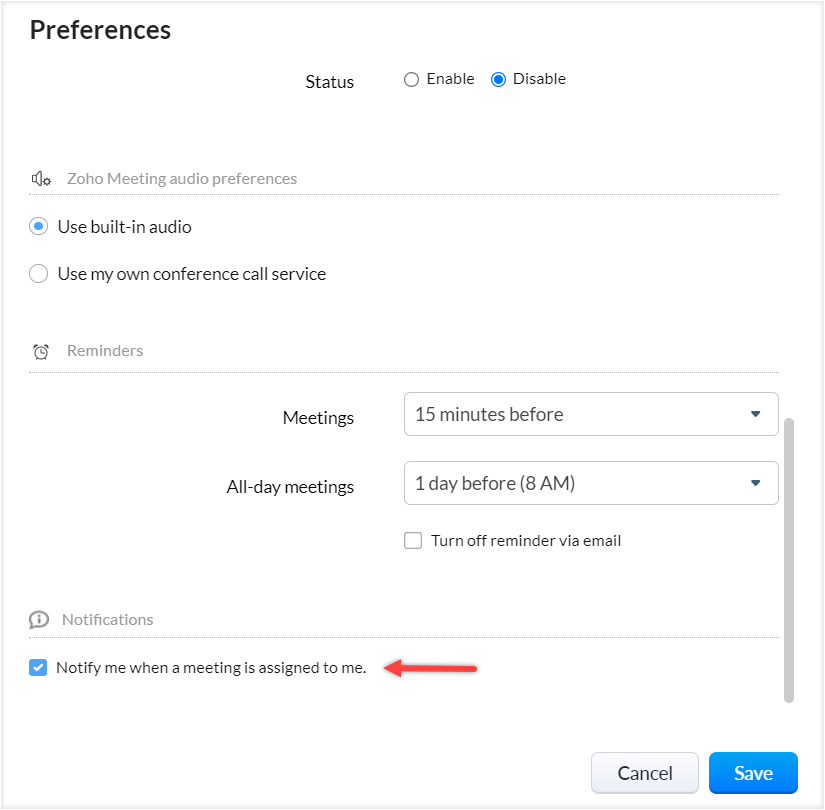 - S elect the Notify me when a meeting is assigned to me checkbox in the Notifications section of the Preferences pop-up.